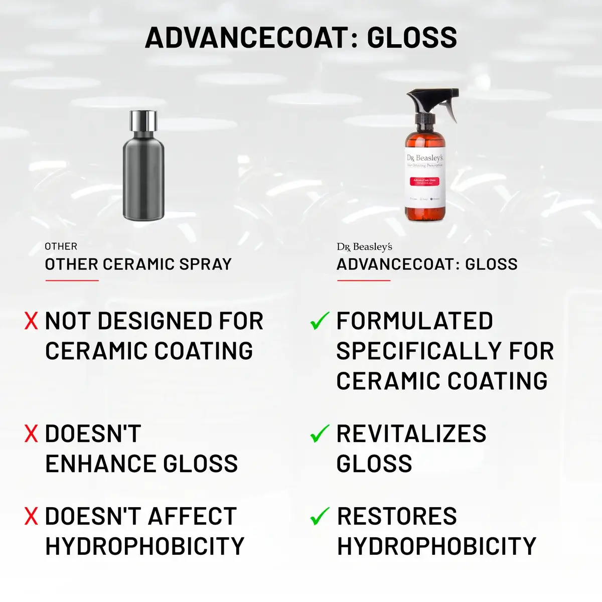 As you drive, wash, and generally use your vehicle, everyday wear on a ceramic coating can cause it to lose some of its original gloss. AdvanceCoat: Gloss restores the ceramic coating’s appearance by reinforcing the nanostructure, restoring a crystal clear, ultra-deep shine.