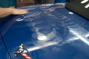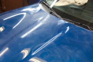 Unlike Mr. Miyagi’s method, the application process is not finished until the wax is allowed proper time to cure to the paint. Cured wax has a noticeable opaque appearance and will haze over the entire surface. Like the photo, this is your cue that it’s time to “wax-off” with a microfiber towel.