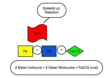 Salt (NaCl) reacts with the metal and oxygen (O2) in the water to form metal oxide. For the sake of an example, Iron will be used as the metal (Fe) to form oxidized Iron, or rust (Fe2O3). The tricky issue with salt is that it never gets used up. As a catalyst it stays present, it doesn’t go away and awaits for more water to continue the reaction. Salt is also Hydroscopic, meaning that it attracts water and continues the reaction. THIS IS WHY it is important to get the salt off your car AS SOON AS POSSIBLE.