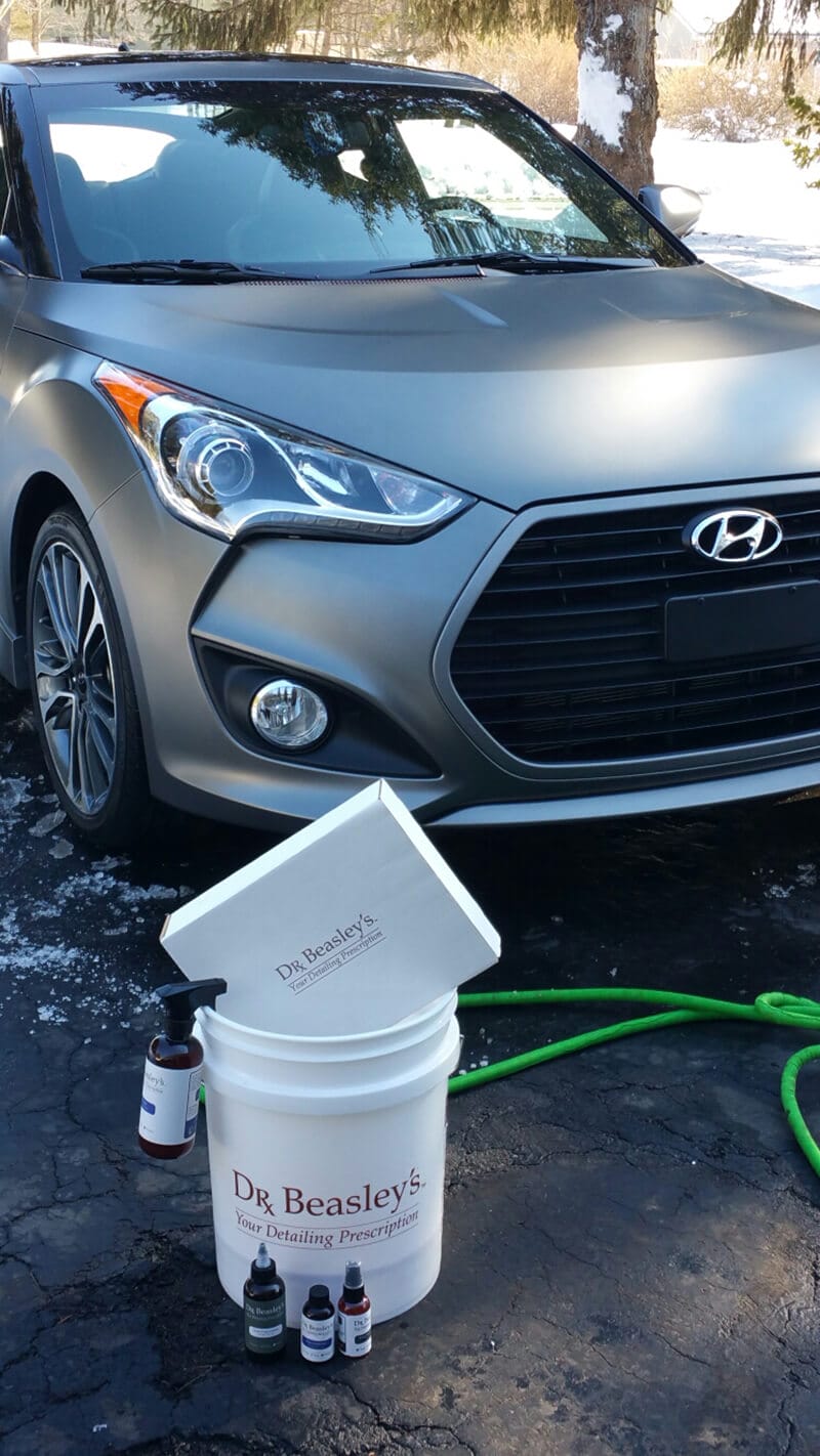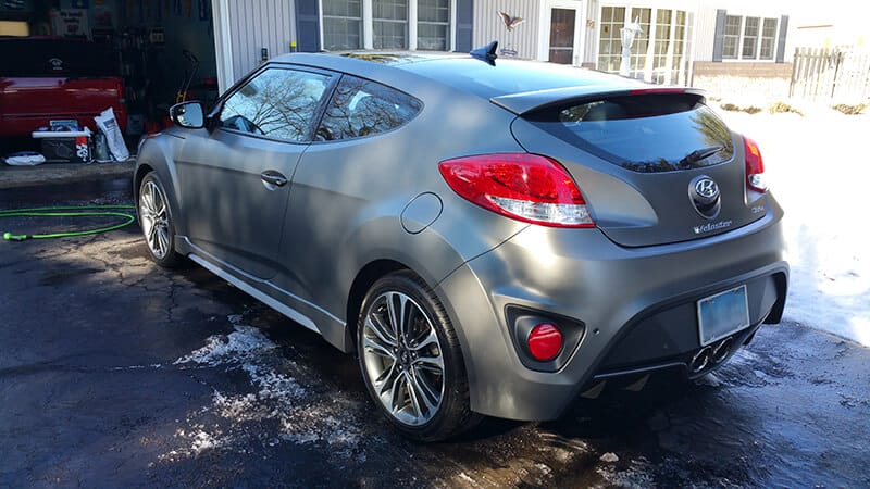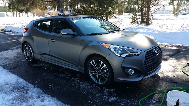 Beautiful paint cared for by customer Kevin using Dr. Beasley’s Matte Paint Prescription. Even in temperatures of 28° F, our products clean and protect flat paint with ease. With 201 horsepower, this 2016 Hyundai Veloster zips through traffic. The matte gray pearl is eye catching, but it also hides dirt and contaminants really well. Hyundai is one of the few OEMs to make matte paint available to the masses and we’re so proud to partner with them for matte paint care. We created our Hyundai VIP program so Velsoter owners like Kevin could have easy access to matte-specific products. Each matte Veloster includes our care kit in the trunk. Kevin shared his photos of his Veloster Turbo and we love them!