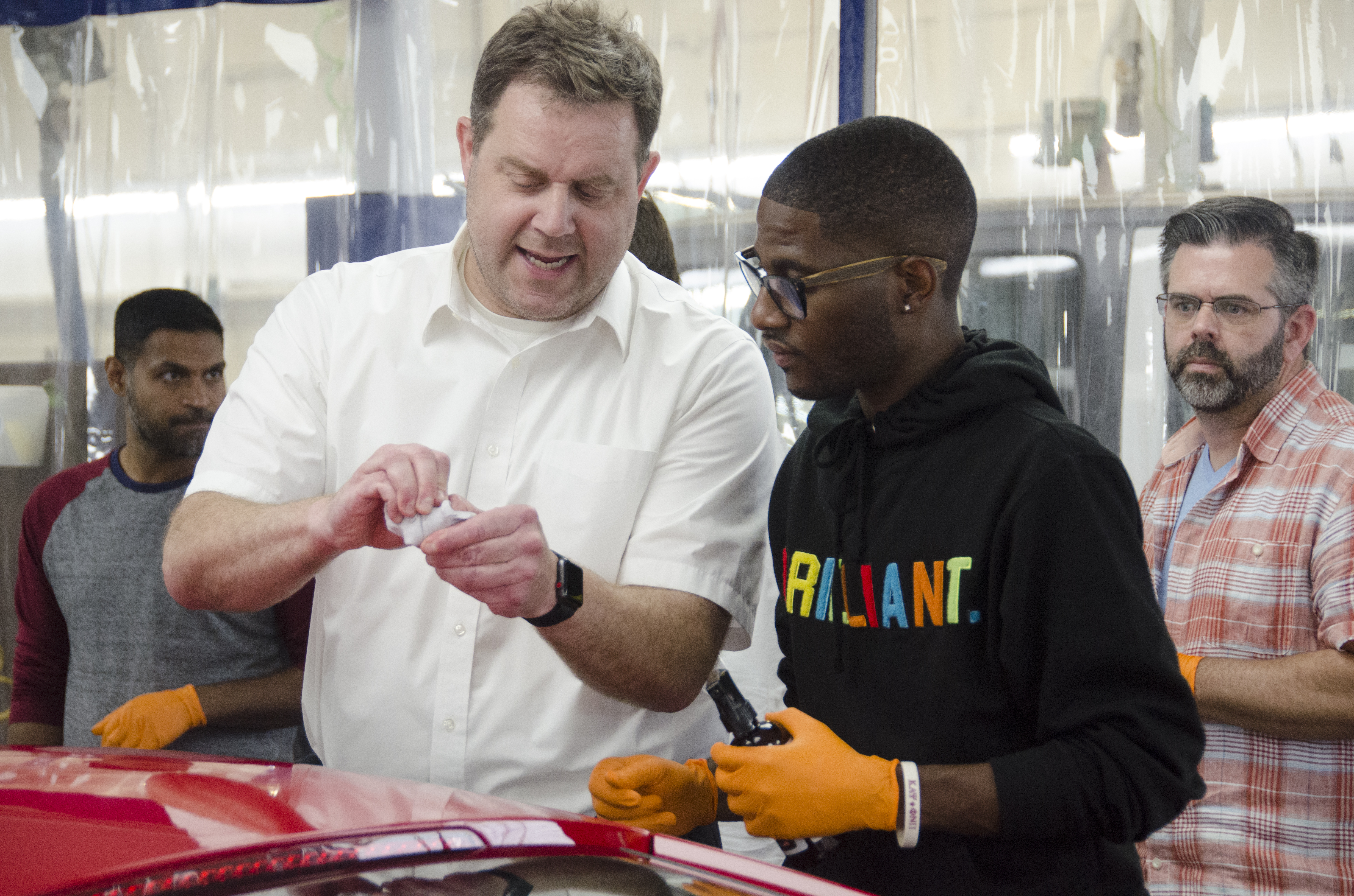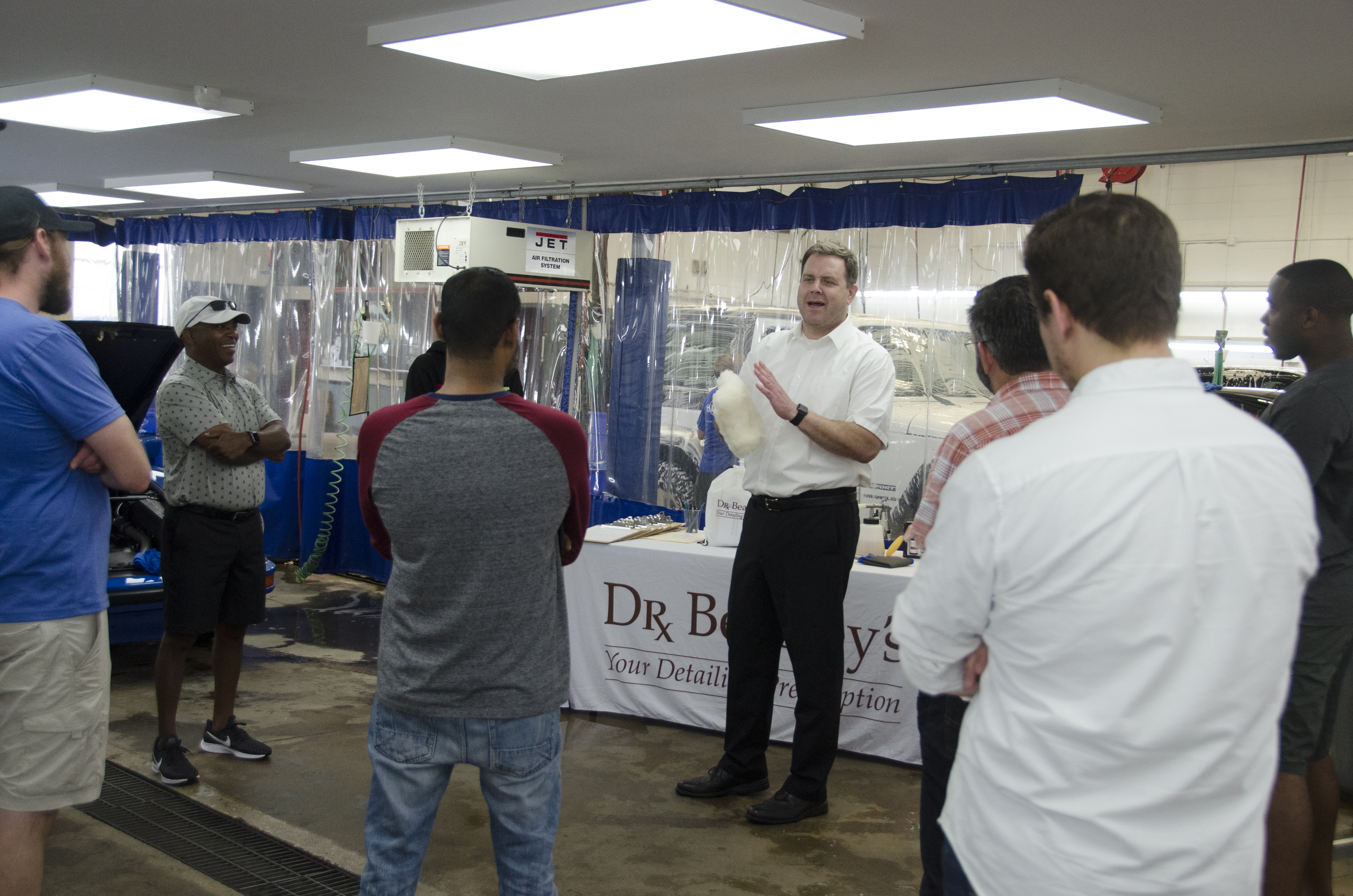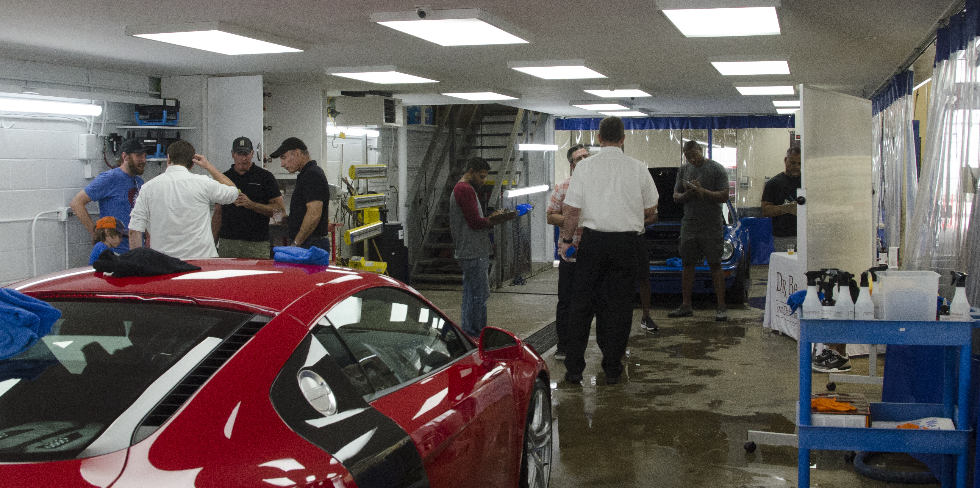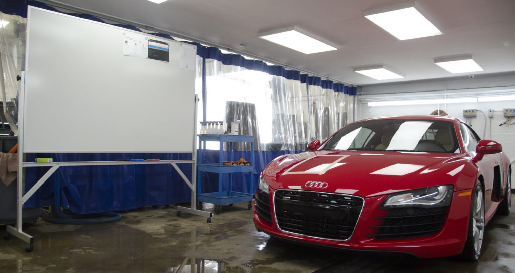 Prior to the workshop we put together a temporary classroom inside the two detailing bays at the west end of the shop floor, complete with a white board, tables, a cart with detailing supplies, and of course, two test cars.