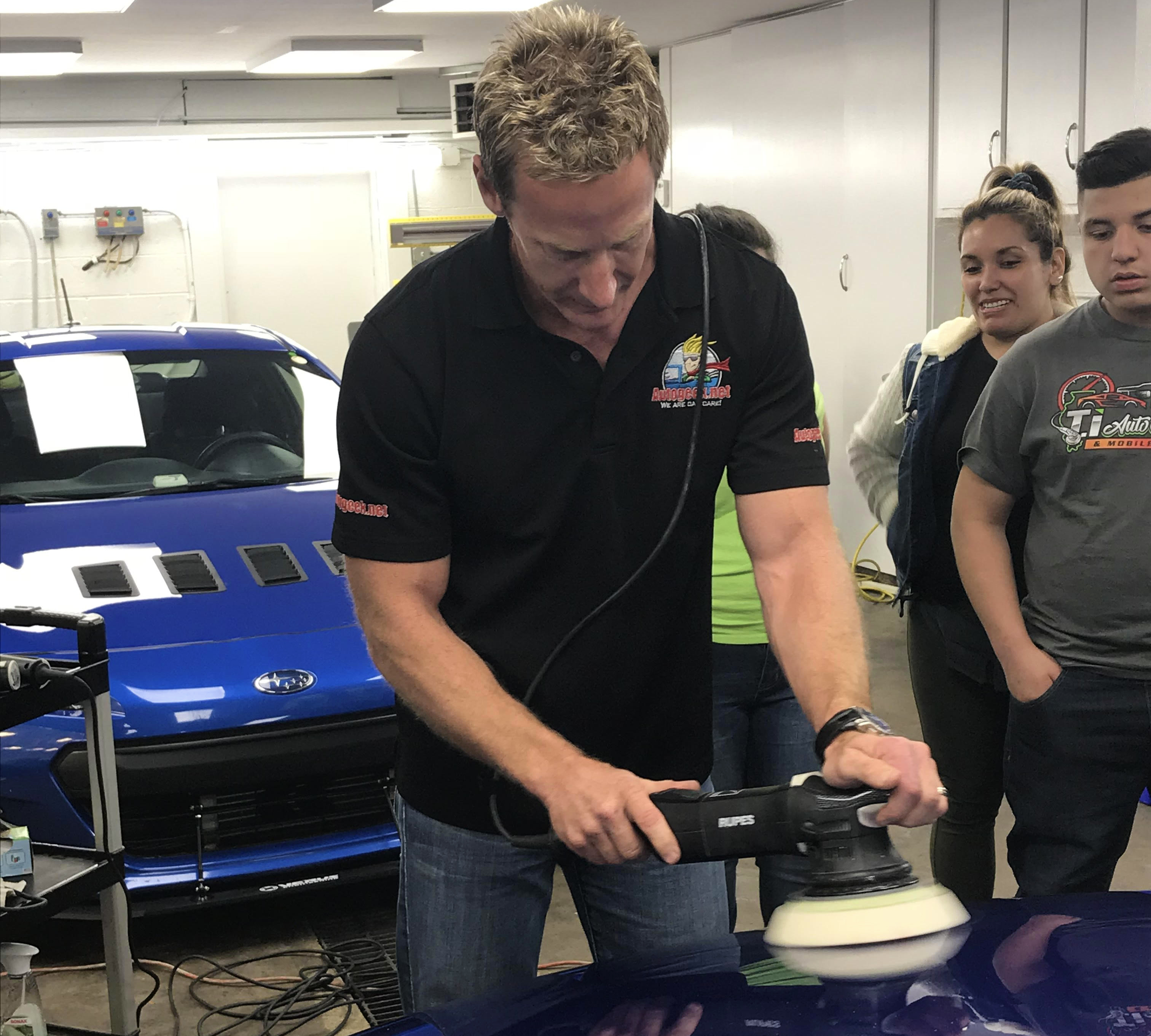 Those next two cars were a Volkswagen Golf R and a Subaru WRX, both in blue. This time students used a rinseless wash to clean. Following the rinseless wash, the class upgraded from clay bars to Nanoskin mitts and towels for the decontamination process. Once decon was done, Mike got students on long stroke buffers as he took them through the Rupes Bigfoot Paint Polishing System, going over the gear-driven Mille, the Duetto, and the iBrid Nano Polishers. Once the cars’ swirls were taken care of, the class used Dr. Beasley’s wet-applying Formula 1201 on the Golf and Nano-Resin on the WRX.