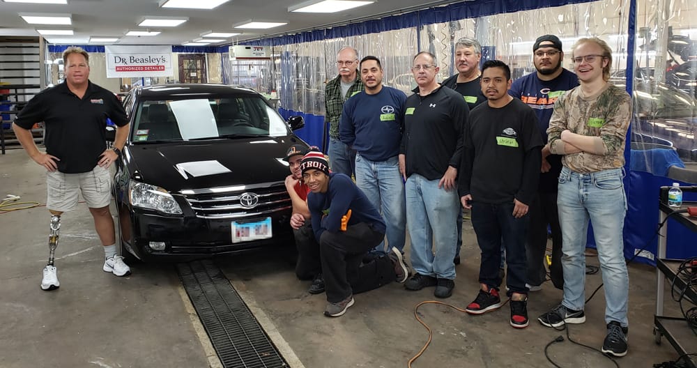 After that, the class foamed up the car again to get rid of all the muck from the glass polishing. While the convertible top dried, students also hand washed and decontaminated a fairly beat-up Toyota Avalon. They also did a chemical decontamination, but because the paint was black we couldn’t see the “bleeding” effect. Thankfully, a student brought in his white Lexus so we could really see the iron bleed off. Using some fallout remover, students sprayed the finish liberally until streaks of purple emanated from the paint. It smelled awful but it was great knowing all that contamination was being removed. Students then got to work buffing the Avalon using FLEX buffers and Sonax polish. We were originally going to do a two-step compound/polish process with this car, but once Mike saw how soft the paint was we stuck with just the Sonax EX-406 polish. The class then coated the paint with Dr. Beasley’s Formula 1201.
