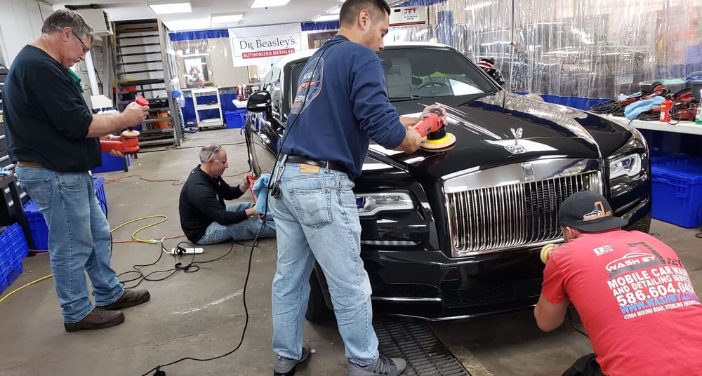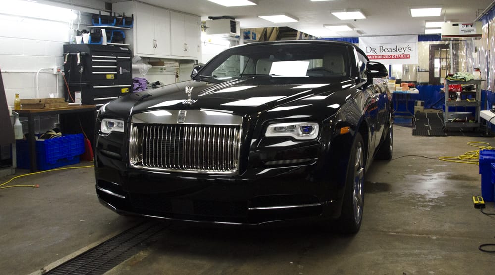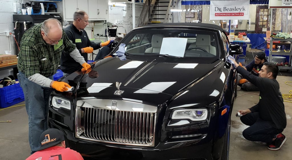 On Saturday we started off with a full hand wash of the test vehicle rather than a waterless wash. The test vehicle was pretty classy—a Rolls-Royce Dawn. First students cleaned the wheels and tires, then the fabric convertible top since we’d be coating it later. They then foamed up the car, washed it, and jumped into mechanical decontamination.