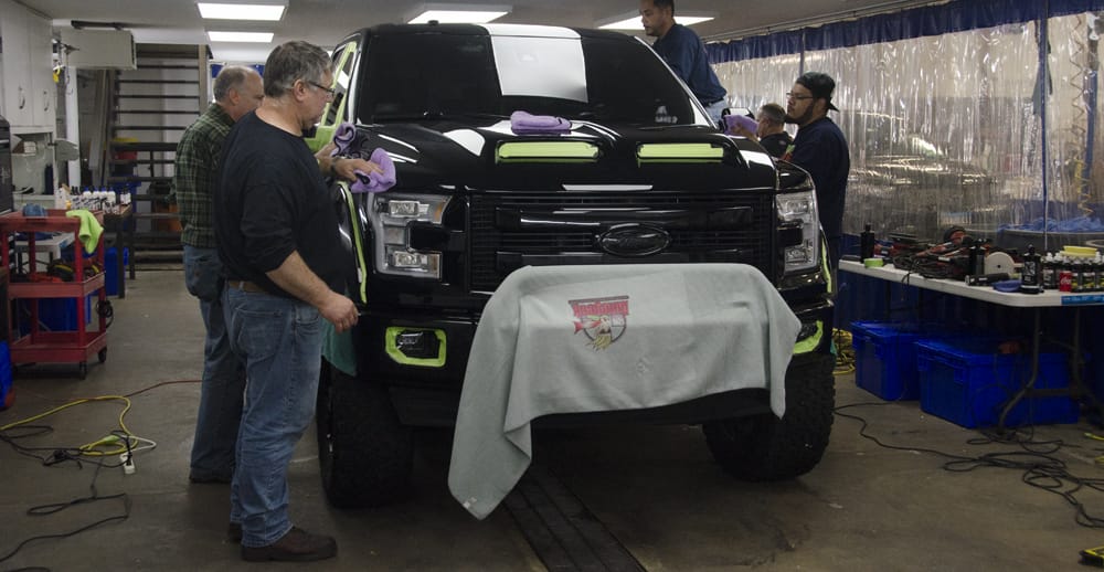 For the final car, a gargantuan Ford F-150 Raptor was driven in. The class taped up its extensive plastic trim and covered the bumper with towels. We then used a one-step cleaner/wax on the entire truck, which definitely took some time considering the vast surface area.