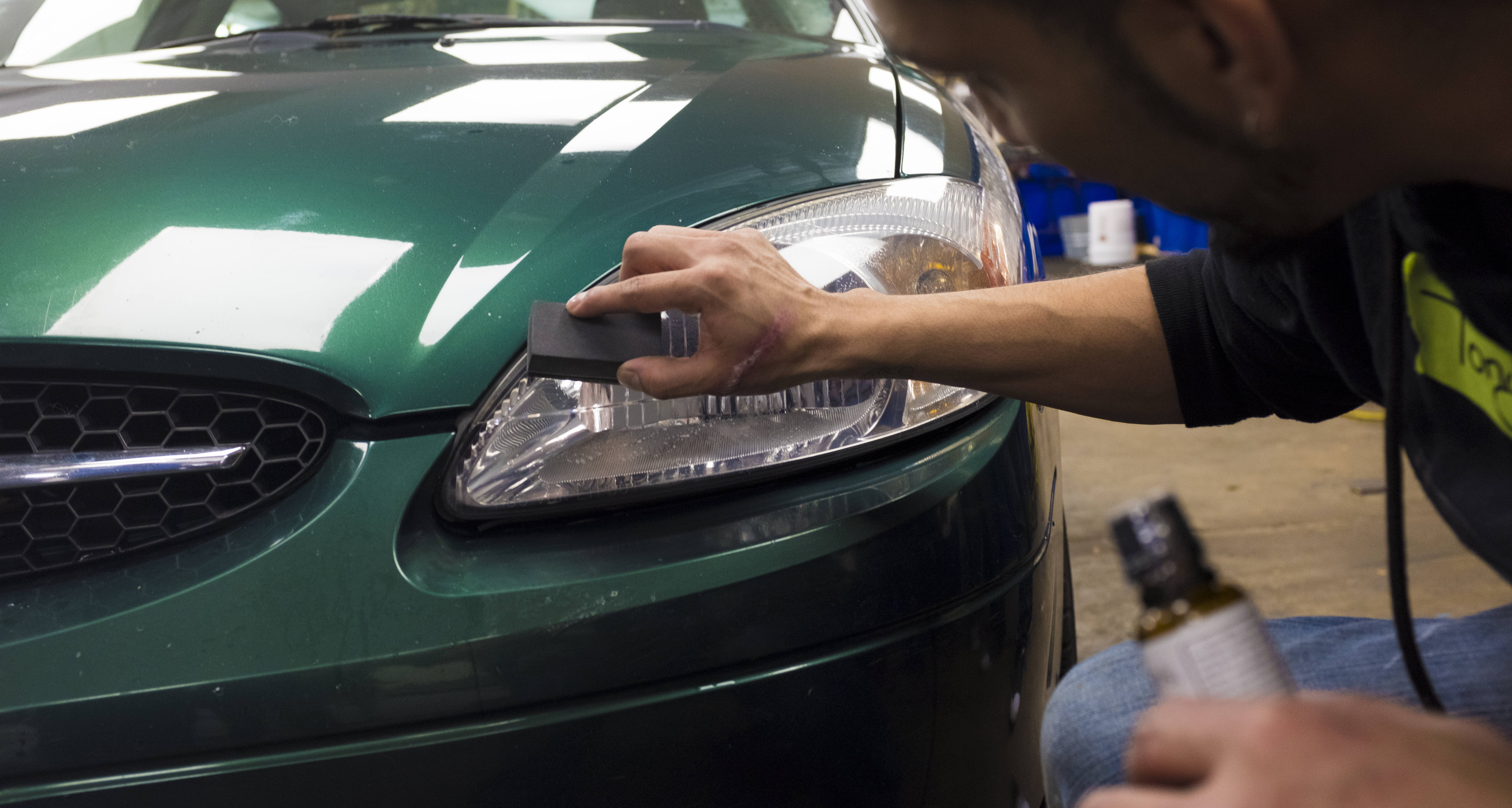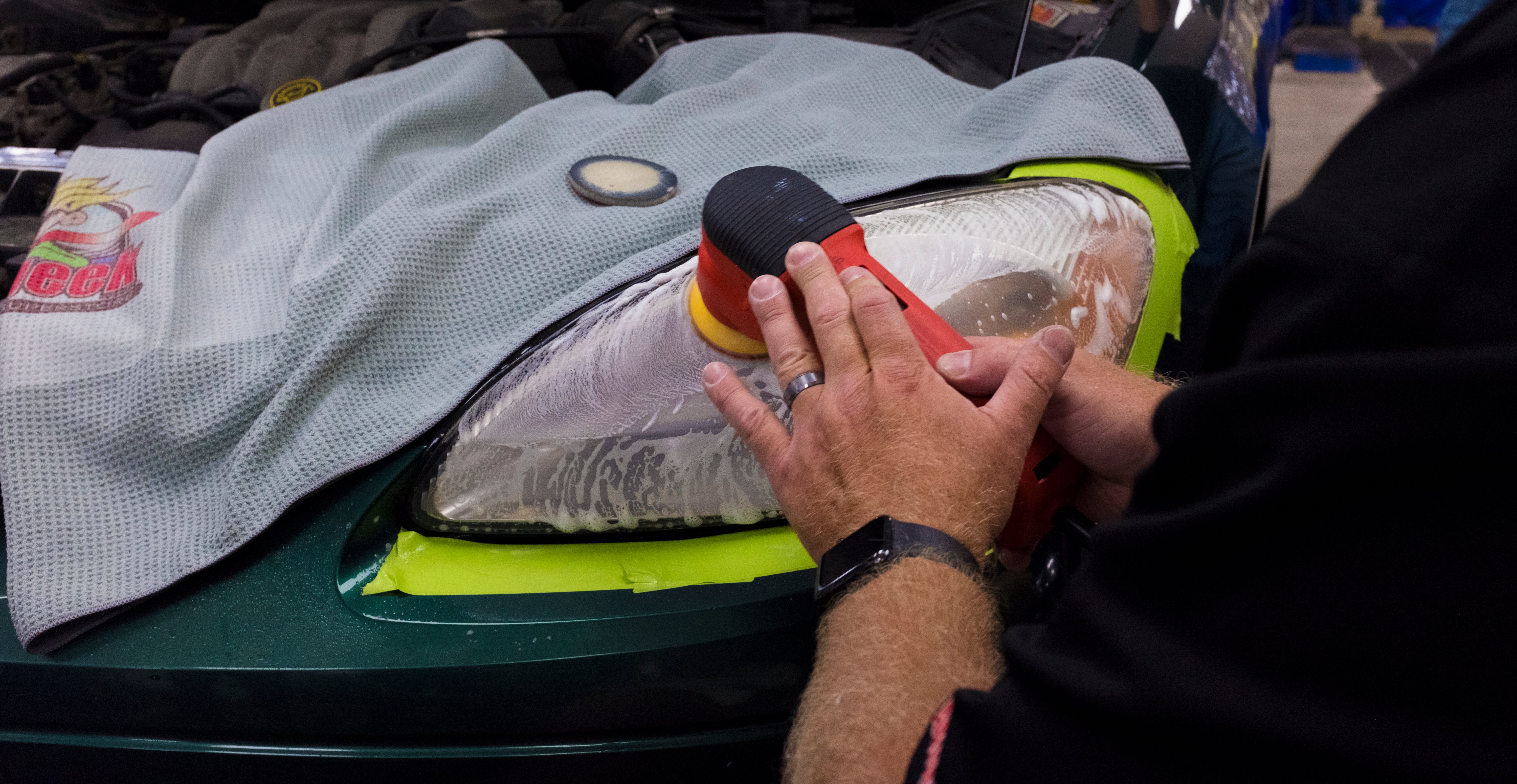 Our final car was a beater of a pick-up truck provided by one of the students. Perfect for a one-step cleaner/wax! This portion of the class allowed students to pick their own tool to use, and pretty soon the truck looked pretty great for what it was! Once the truck was finished up, Mike took the class through a few miscellaneous topics. First was a headlight restoration demo. Mike used a student’s Ford Taurus with some oxidized lights. On one headlight he hand-sanded, which achieved decent results. The other he machine sanded with multiple passes, then had our shipping manager Tony Morales seal the work with Dr. Beasley’s Headlight Coating.