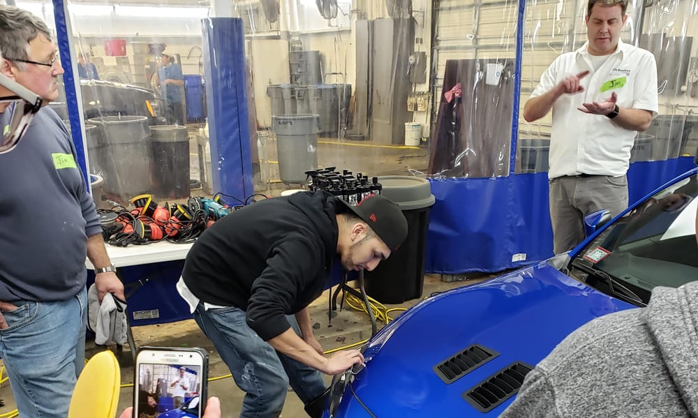 Next up was a wet sanding demo. Using a test hood, Mike took the class through the complexities of this aggressive correction method. It’s no simple process, with dozens of steps involved. Still, it was great to see such an intensive procedure first hand!