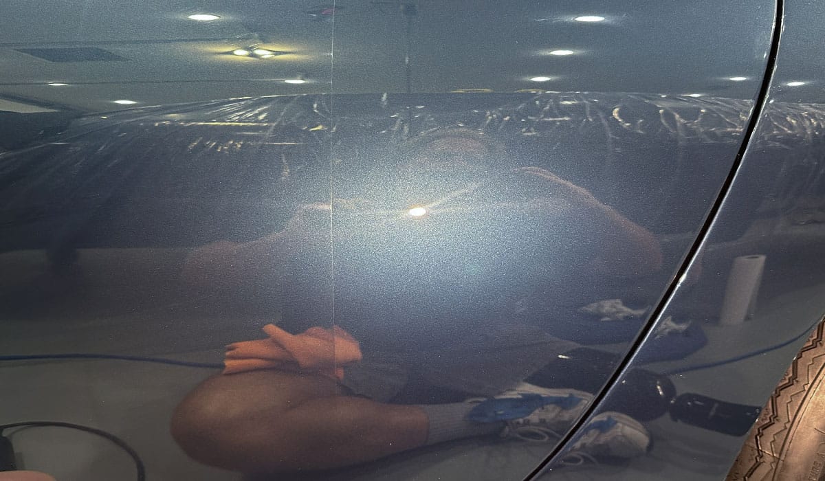 Here’s me putting a swirl finder light on the driver’s door. See the faint but visible wispy lines or patterns in the paint?