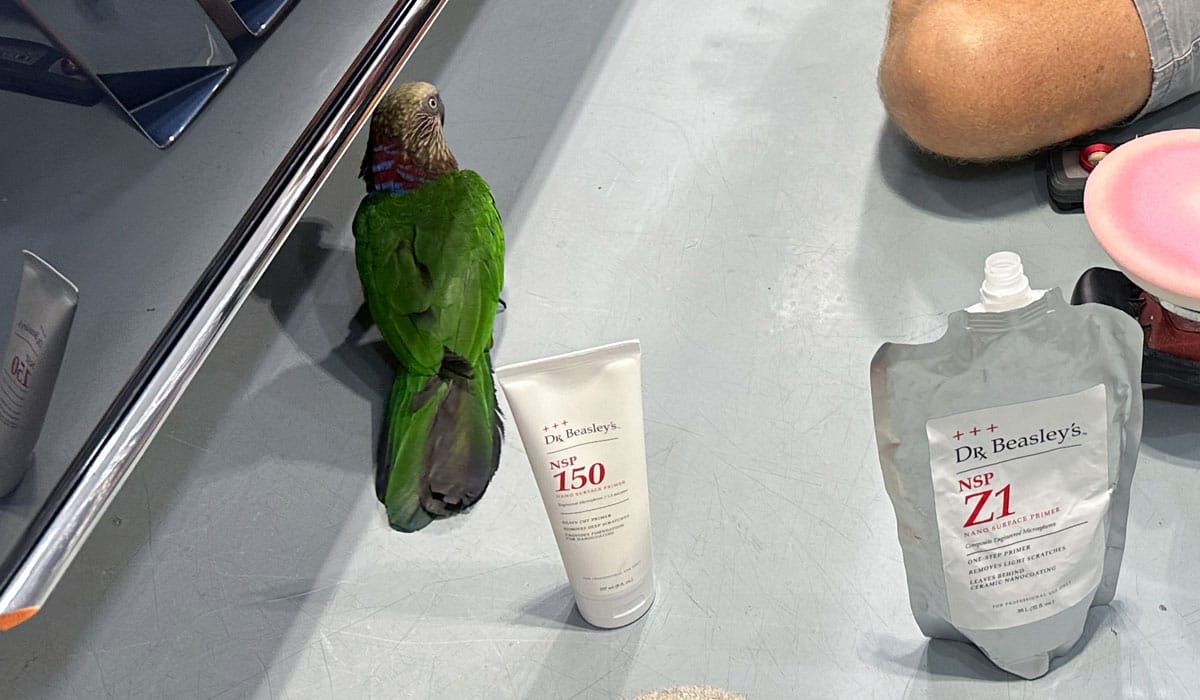 Claude is a Hawk-Head Parrot with his own Facebook page. Claude was intrigued by all the noise I was making with the polisher. He walked over to inspect me and I think I got his approval!