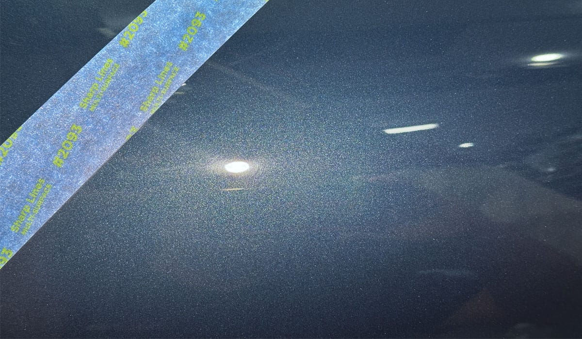 The driver’s side door had holograms. Holograms are a distinct scratch pattern instilled into the paint from the use of a rotary buffer and in most cases some type of fiber pad. The damage on the passenger side front fender was from some surgical panel straightening. The prescription for the remedy was the same, however — some NSP 150 to remove the deepest of scratches followed by Z1 to perfect the finish.