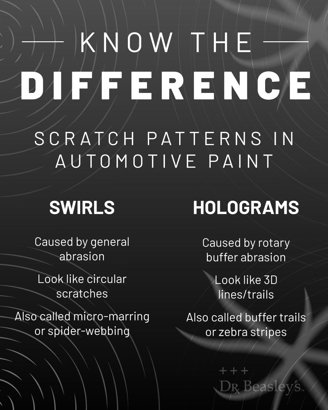 Some people think the words swirls and holograms refer to the same type of scratch pattern you see in car paint under bright sunlight or with the use of a bright swirl finder light. This is a common misconception. Swirls and holograms are actually two distinct types of scratch pattern.