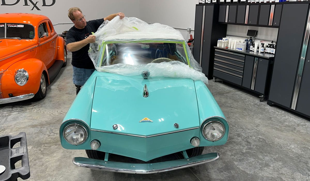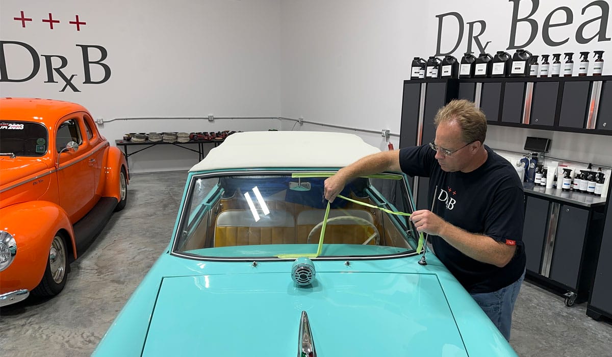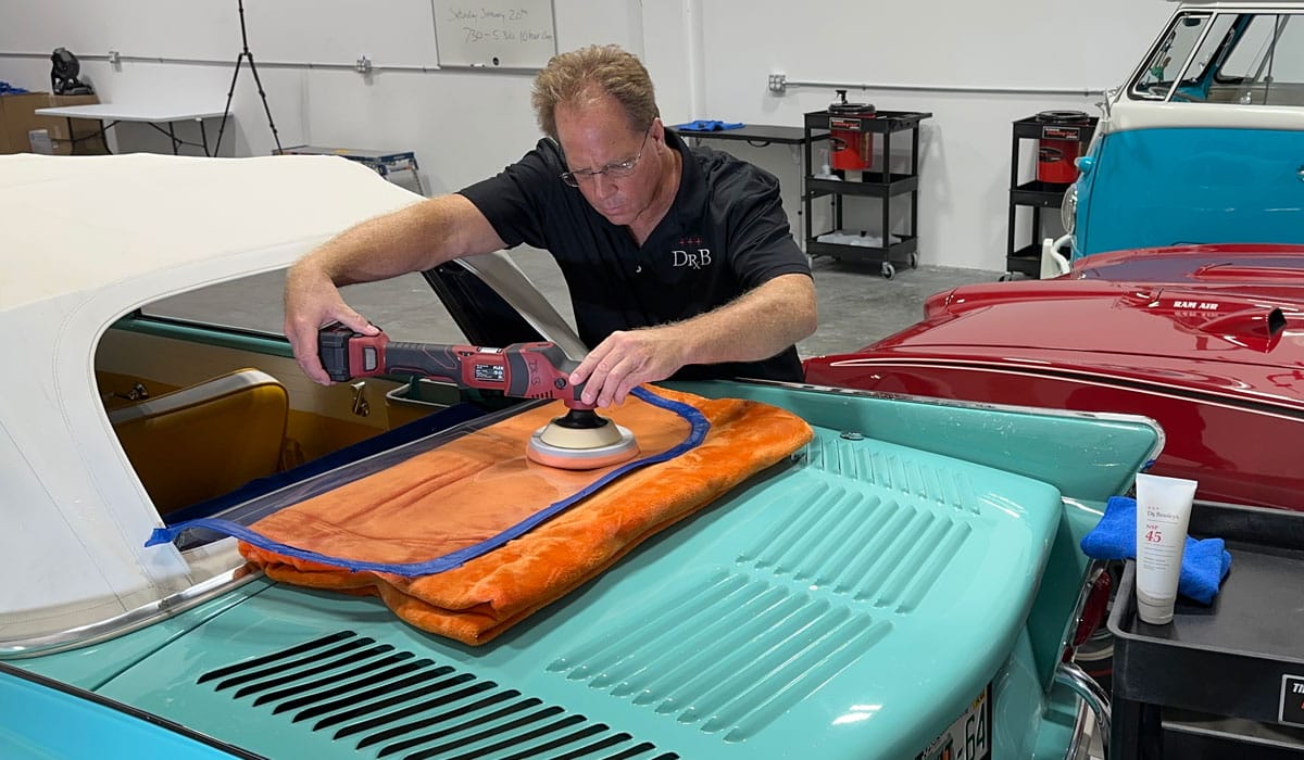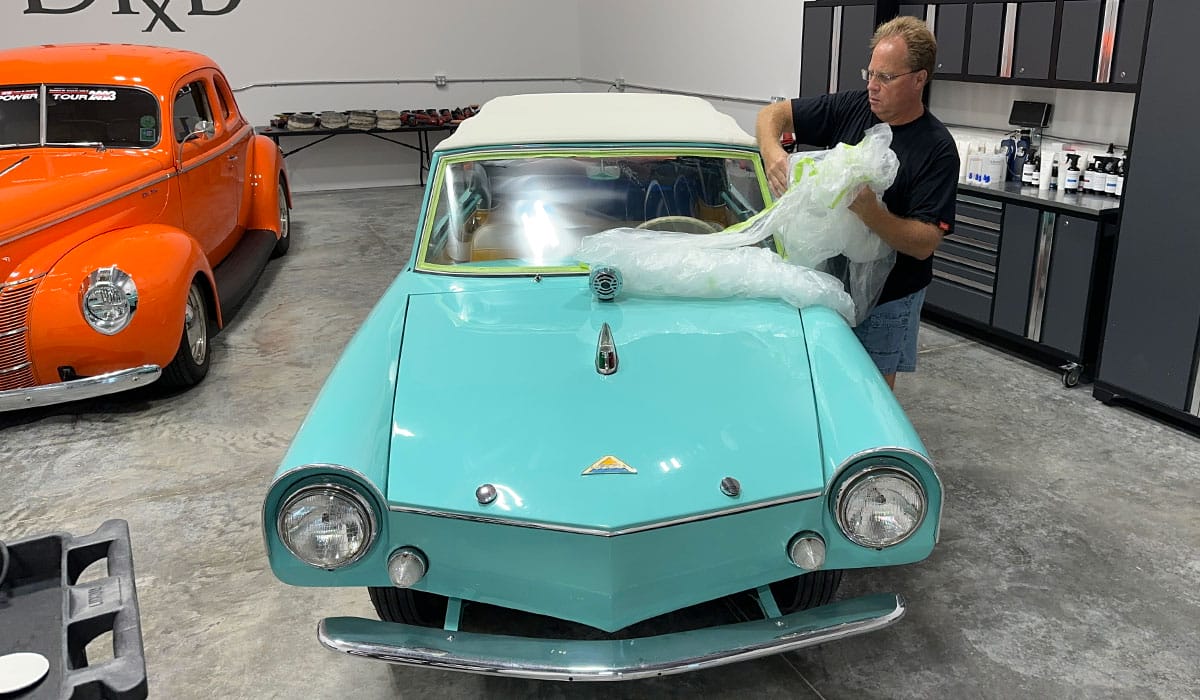I have performed sub-surface glass polishing on a lot of classic cars and even though I’m going to wash this Amphicar after polishing the glass and plastic windows, I still want to cover and protect all the nearby adjacent body panels as well as the vinyl roof. It’s the nature of a rotary polisher because it spins a buffing pad in a circular motion, to sling tiny splatter dots of product outward via centrifugal force. So I like to tape-off and cover-up everything surrounding the windshield.
