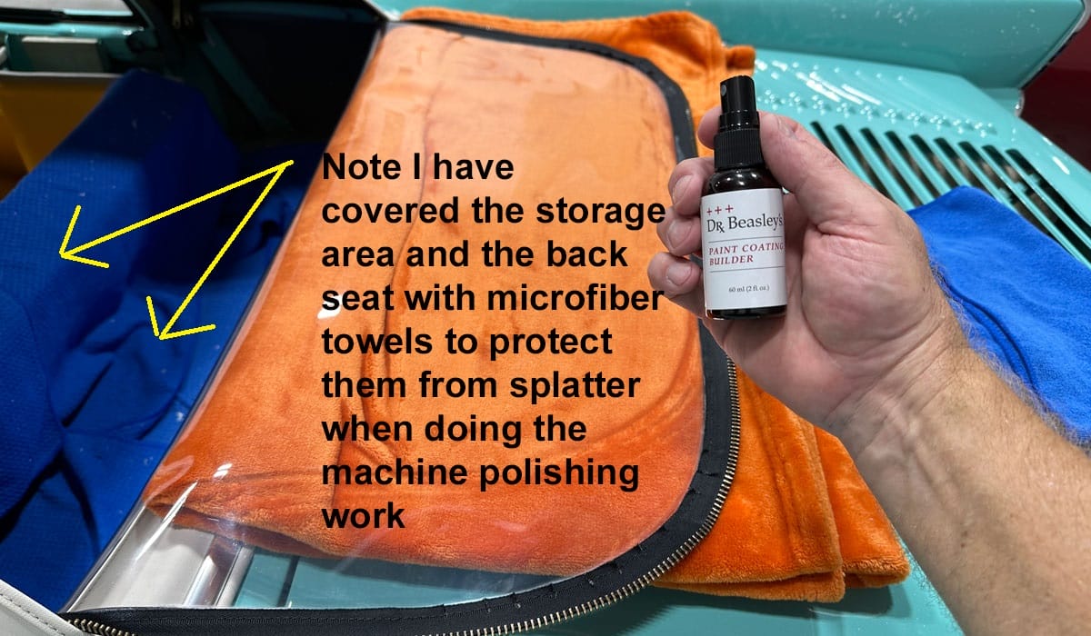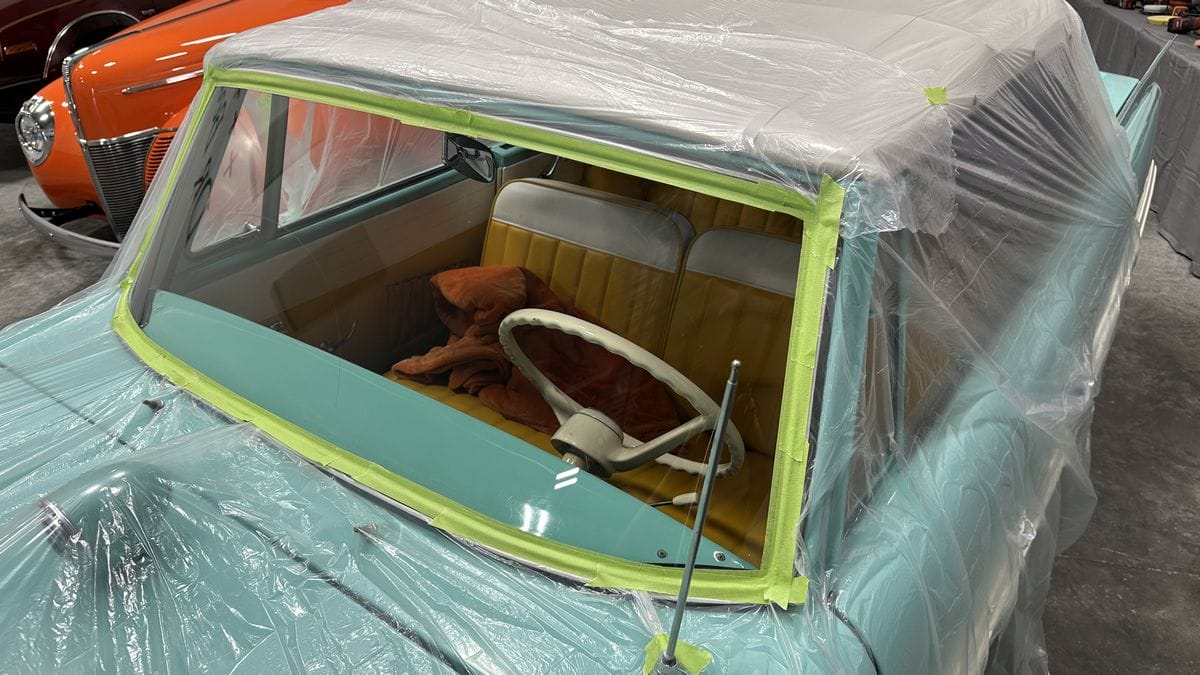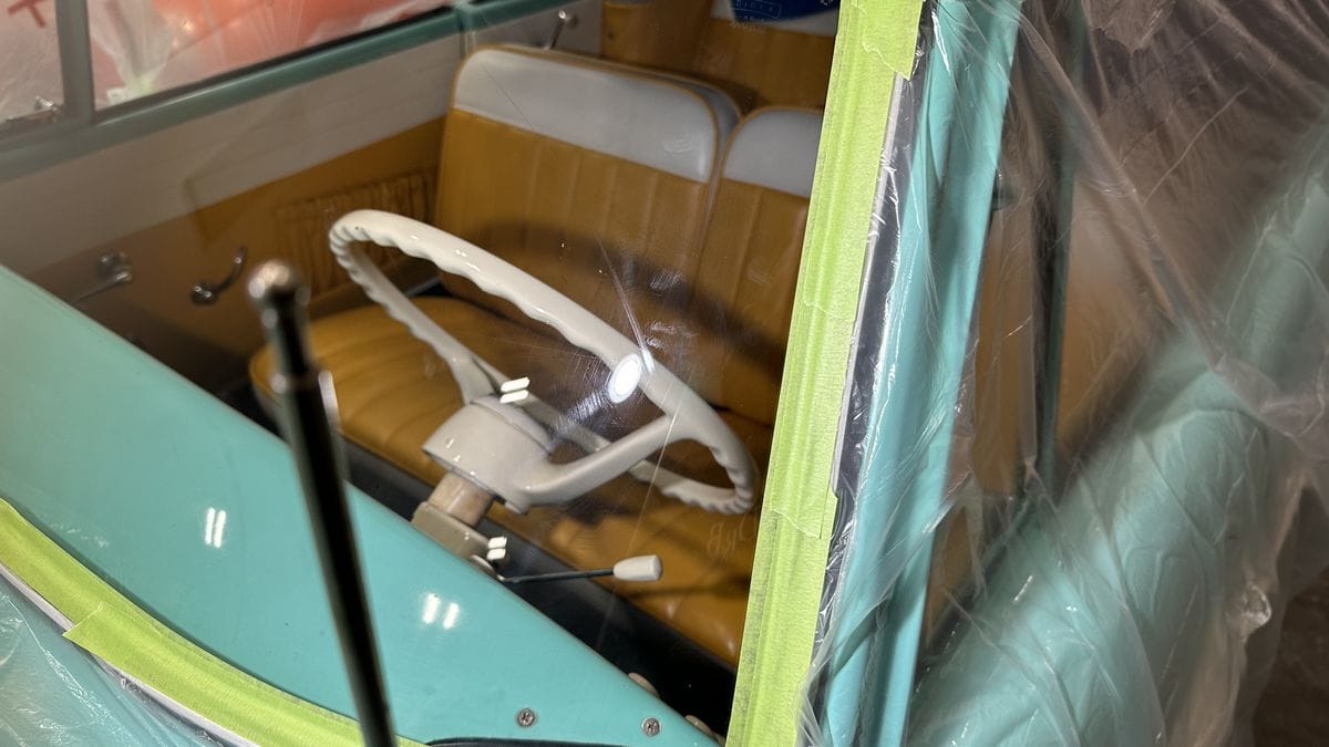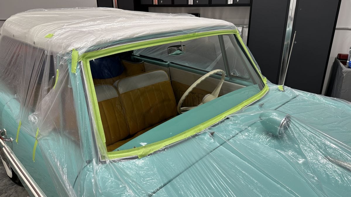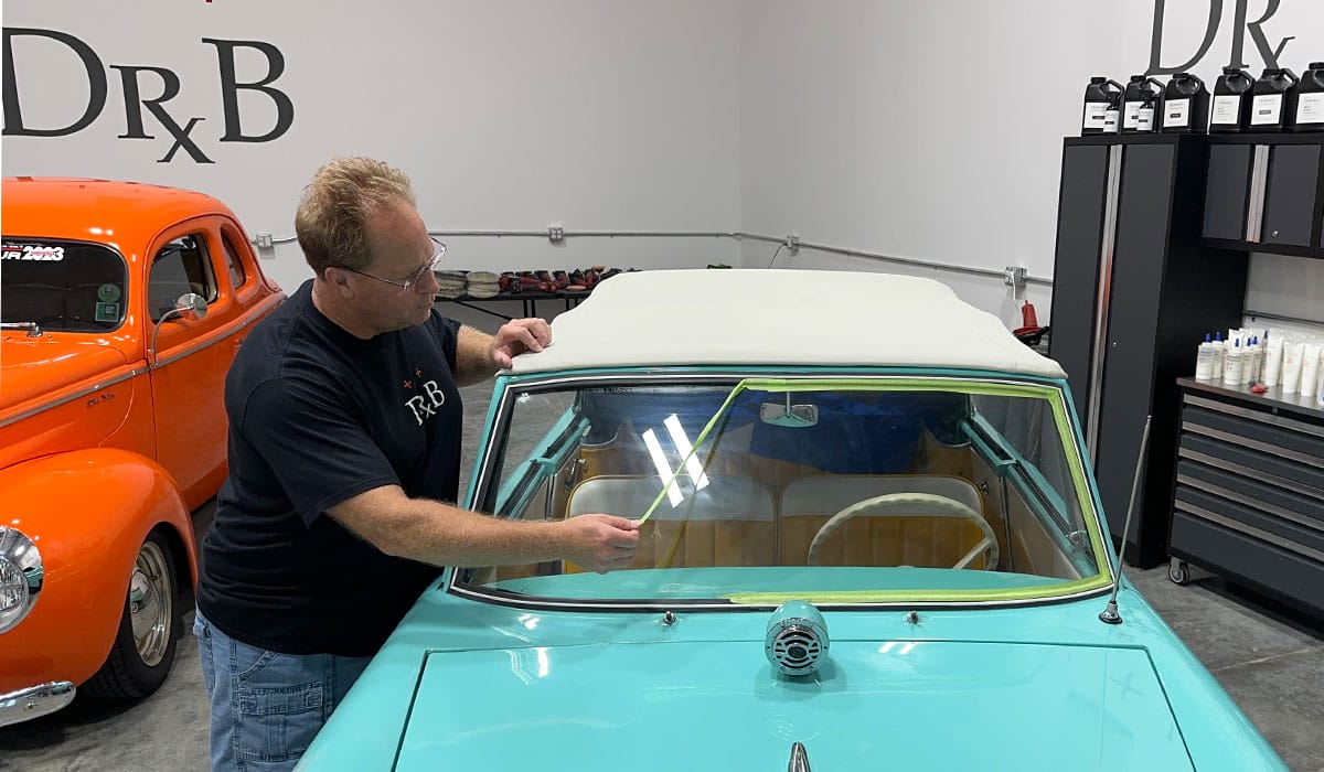 I have performed sub-surface glass polishing on a lot of classic cars and even though I’m going to wash this Amphicar after polishing the glass and plastic windows, I still want to cover and protect all the nearby adjacent body panels as well as the vinyl roof. It’s the nature of a rotary polisher because it spins a buffing pad in a circular motion, to sling tiny splatter dots of product outward via centrifugal force. So I like to tape-off and cover-up everything surrounding the windshield.