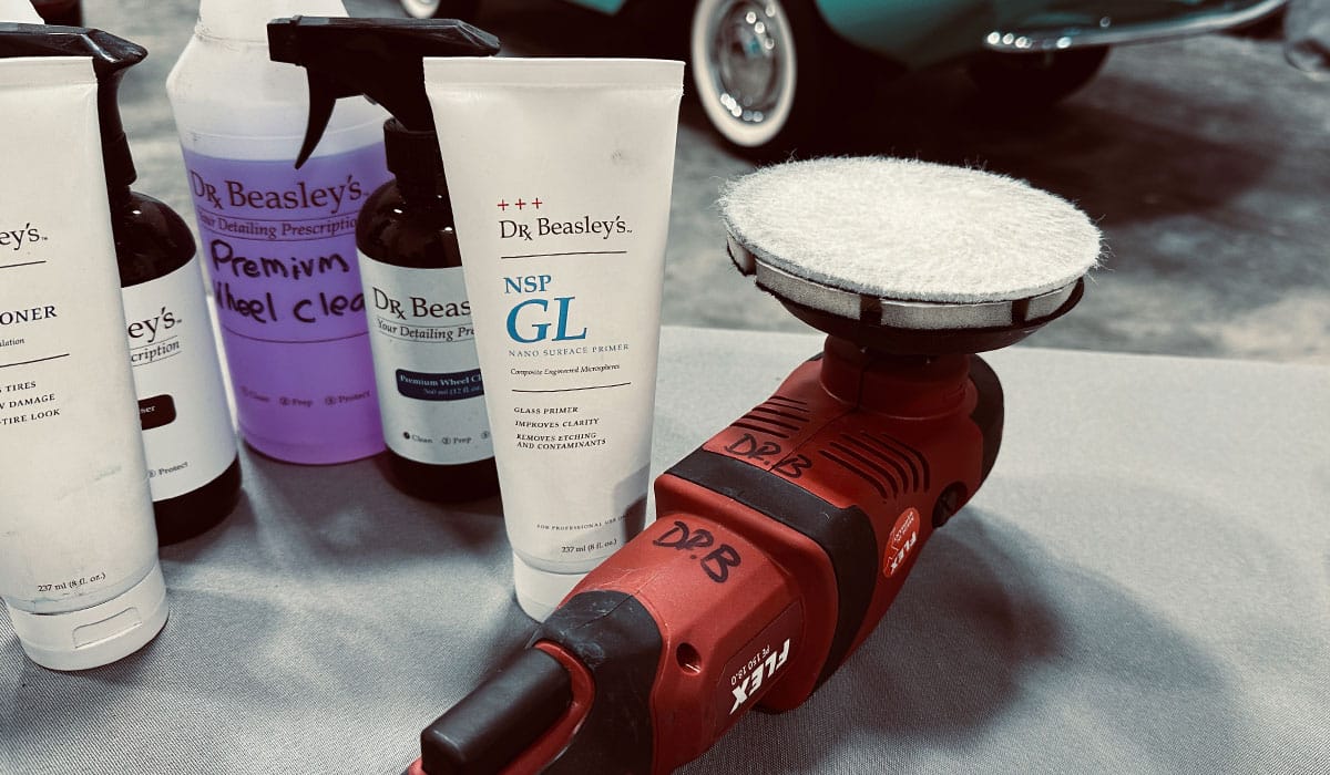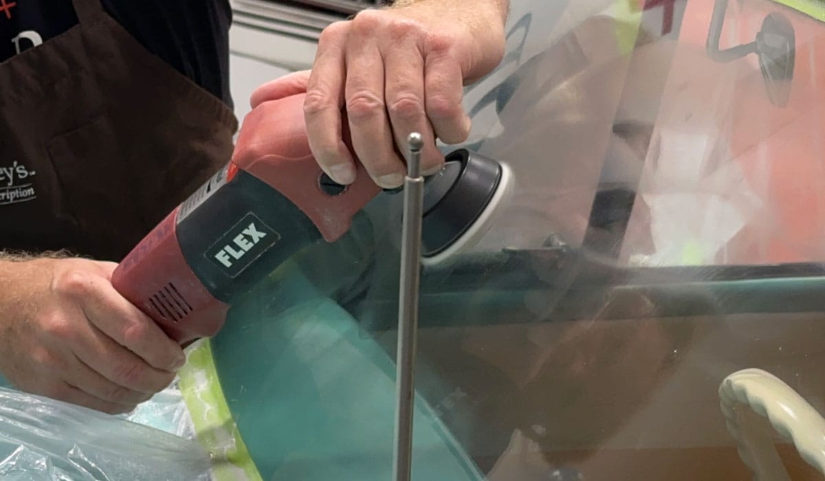Because we are a car and boat detailing training center for Dr. Beasley’s detailing classes here in sunny, Stuart, Florida – I have multiple FLEX rotary polishers. To make the process faster and to help avoid extreme heat to the windshield, I set up two workstations. Each workstation has a FLEX rotary polisher, rayon pads, Dr. Beasley’s NSP GL Glass Polish and of course, plenty of microfiber towels. My normal process will be to buff for a few minutes on one side of the windshield and then move to the other side and buff. By moving from side to side, it gives one side of the windshield time to cool down as I work the other side.