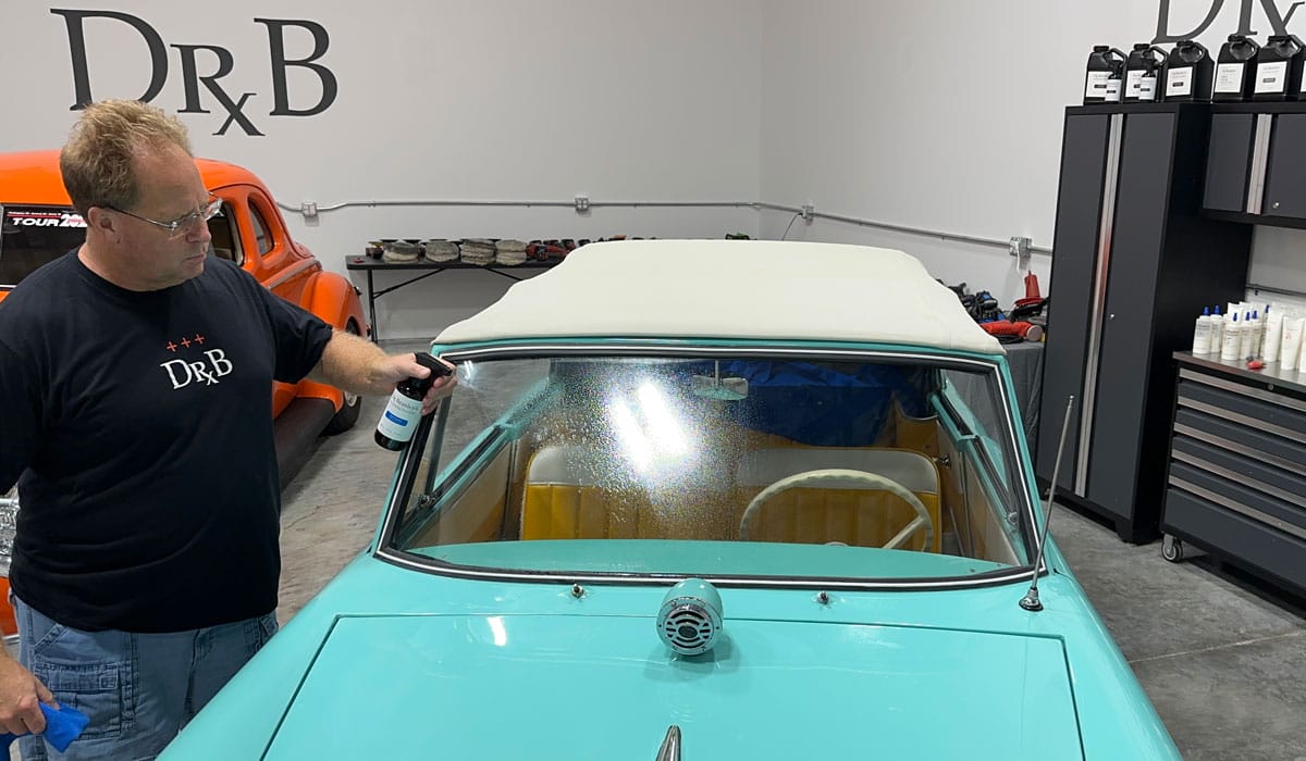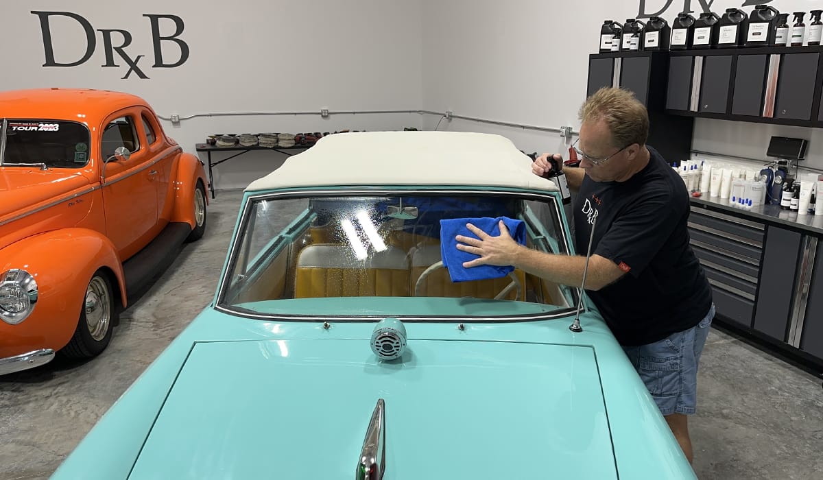I brought my Lake Country Swirl Finder Light with me and upon inspection the first thing I noticed is there are wiper scratches or wiper marks in the glass windshield. Wiper Marks are scratches and sometimes deeper gouges in the glass caused by worn out wiper blades and in extreme instances, the wiper arm actually rubs against the glass. Wiper Marks are unique compared to normal swirls and scratches in glass because the scratches are instilled in an arc shape that mimics the path the wiper blades travel over the glass. This type of defect is all too common with classic cars but luckily, Dr. Beasley’s as a solution to this problem – Dr. Beasley’s NSP GL Glass Polish and Rayon Glass Polishing Pads.