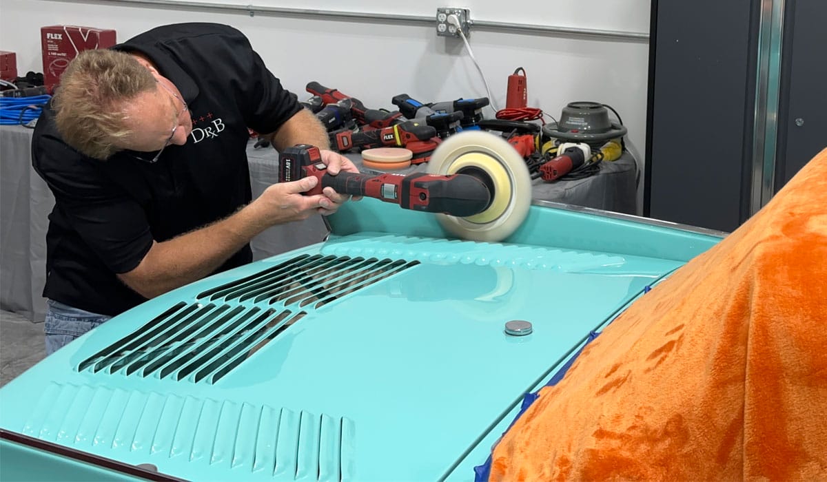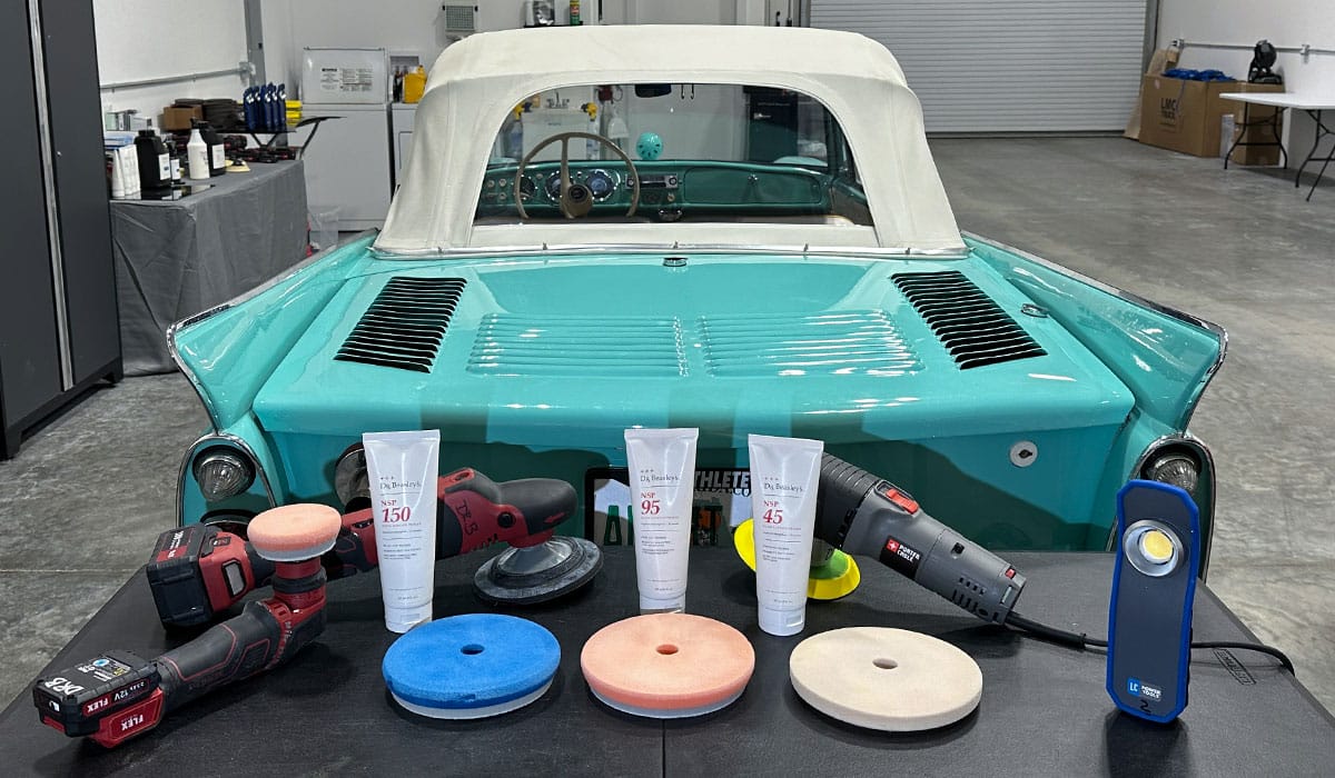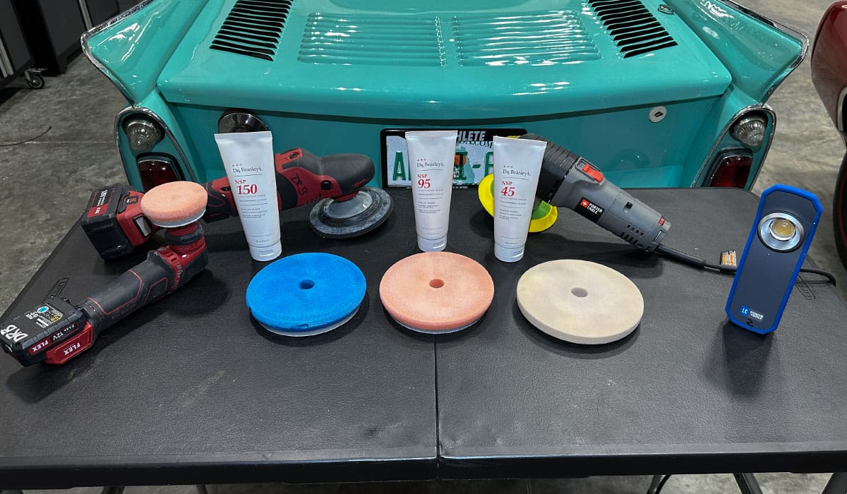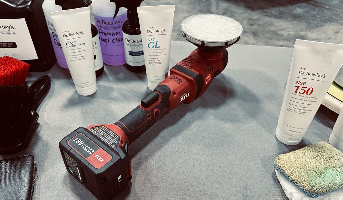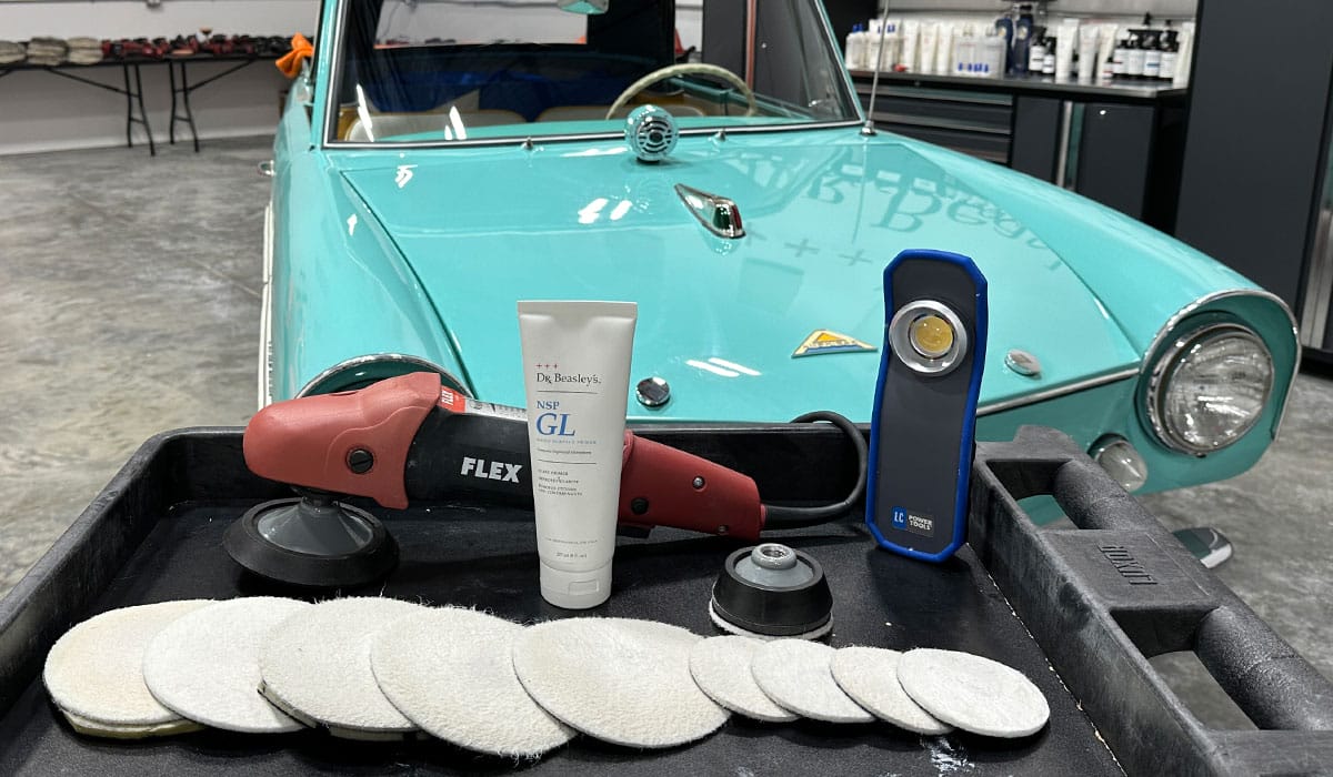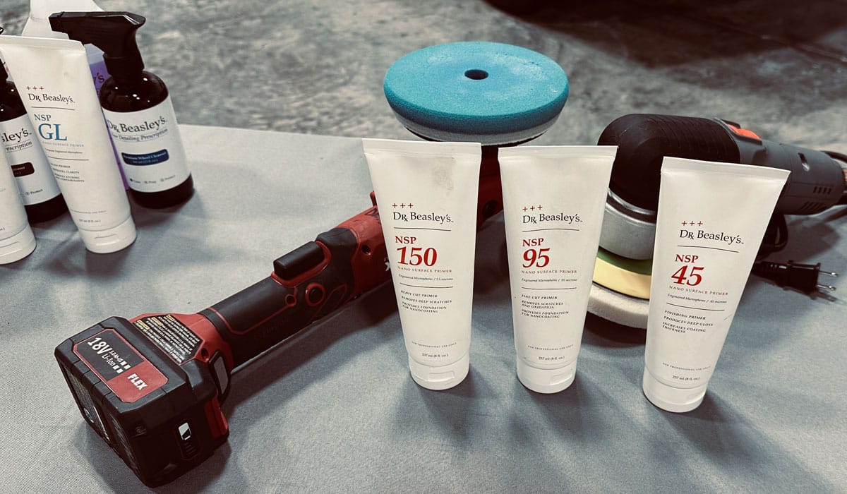 The primary products I used were all 3 of the NSP Primers, the NSP 150 for the initial cut, followed by the NSP 95 for the refining step, followed by the NSP 45 for the final polishing and clarifying step. Pads used were the Dr. Beasley’s HDO foam pads and the tools used were the FLEX cordless PE-150, the FLEX PXE-80 for getting into the corners and the Porter Cable 7424XP for the final polishing step.