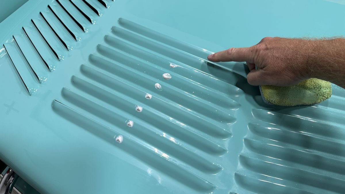 When polishing louvers, if you don’t mark each louver like you see me doing below – it will become confusing as to which lovers you’ve polished and which louvers you have not polished. Just take my word for it as I’ve polished a LOT of louvers in my life. So, here’s my technique tip – place a small drop of product on each louver. First, you need some product to work with, but more important you have just VISUALLY marked each louver s as you’re working your way down a row of louvers, you’ll be able to easily see which louver’s you’ve polished, and which louver’s still need polishing. May seem simple but it works.