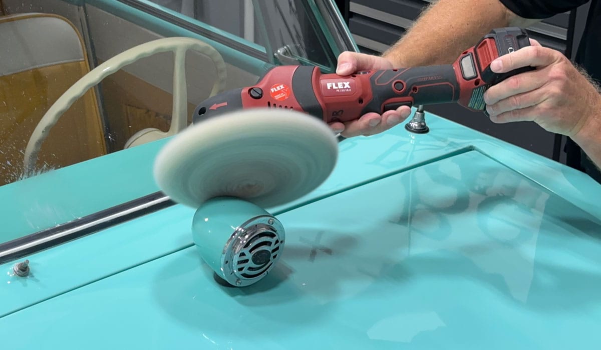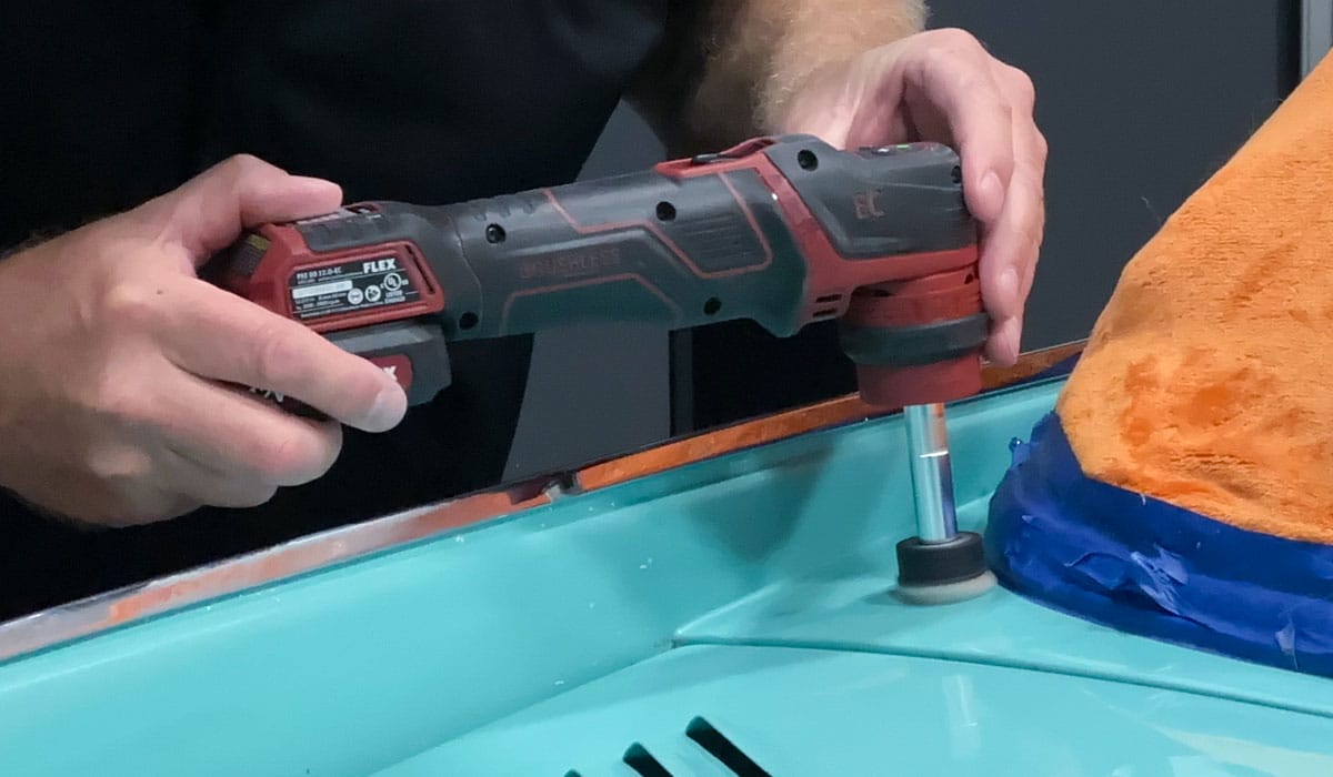 For the first two steps, I used a FLEX cordless PE-150 Rotary Polisher. The nature of a rotary polisher is it will correct defects faster, but it will aways tend to leave a holograms in the surface of the material you’re buffing be it a flexible plastic window like you see me working on or car paint, gelcoat boats, etc. For the finishing step, to remove any holograms caused by the foam pad material and to perfect the results while maximizing optical clarity, I switch over to a Porter Cable 8mm free spinning random oribital polisher with a soft foam finishing pad and Dr. Beasley’s NSP 45.
