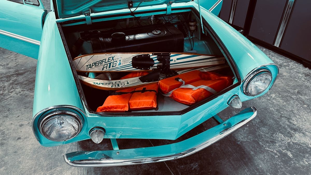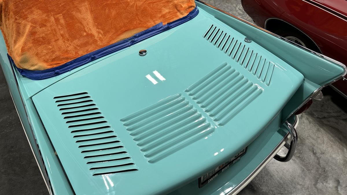 This is a rear-engine powered car. As such, there’s no need for a grill like most cars at the front and instead there’s a bow for breaking through waves. Because this is a water-cooled Triumph Herald, inline 4-cylinder engine, in order to divert air to the radiator, which is located under the rear decklid, the rear decklid as a series of 4 rows of louvers.