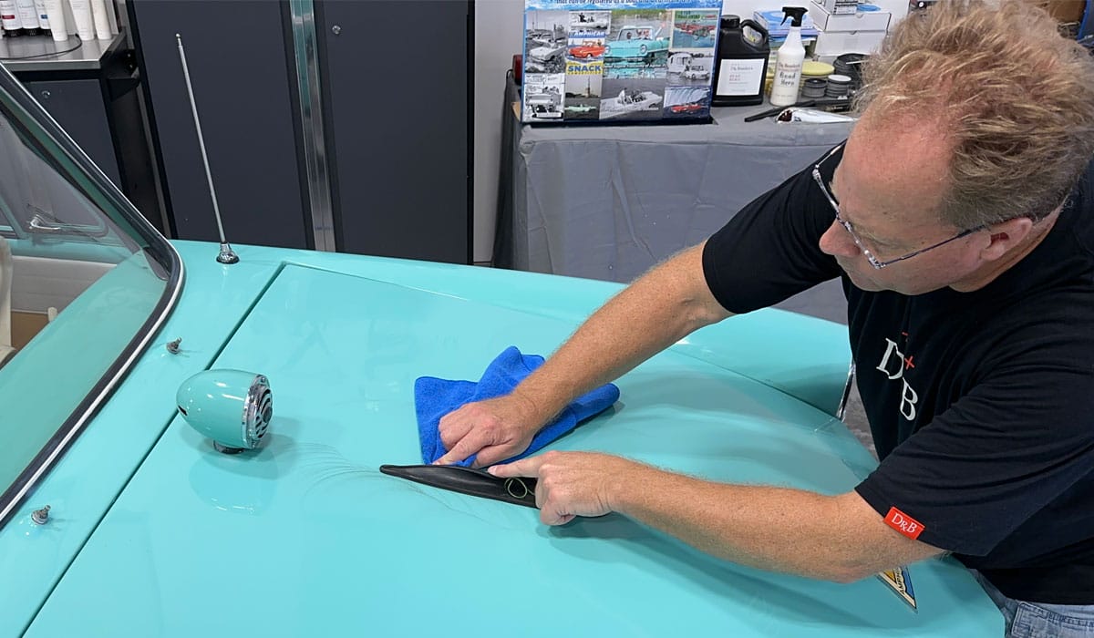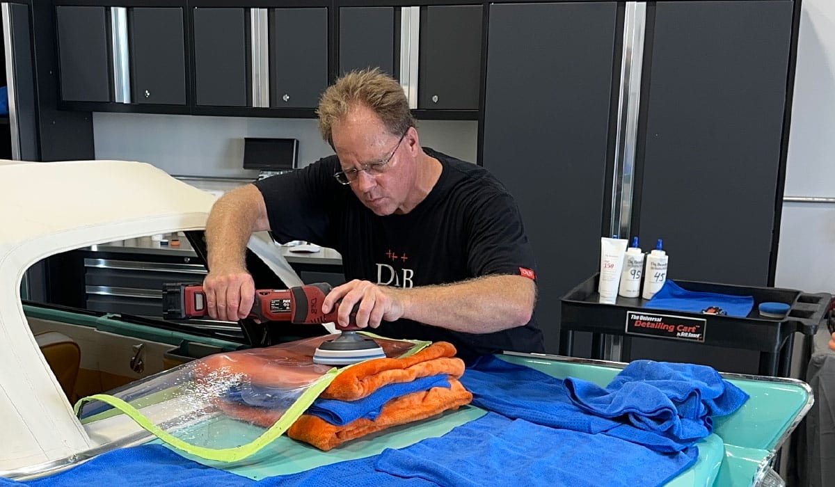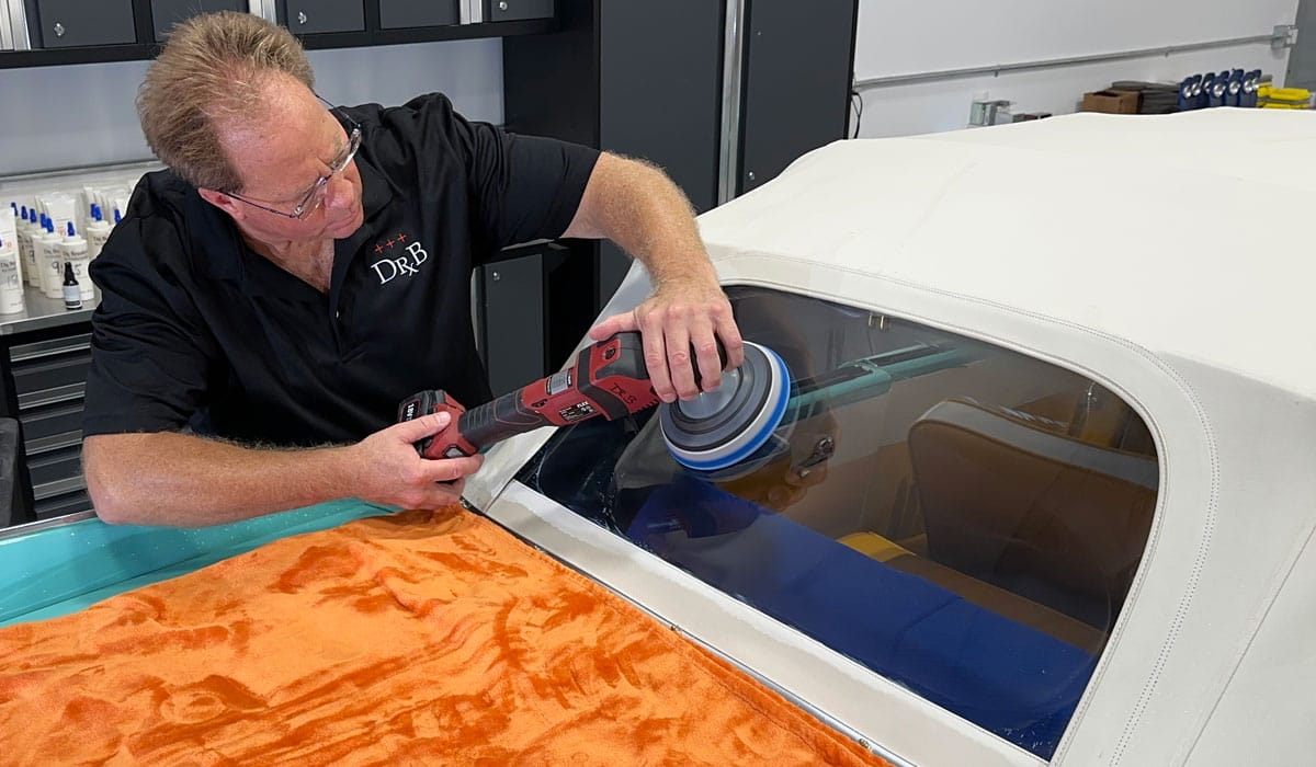 After machine polishing both sides of the inside of the window with a Dr. Beasley’s HDO Blue Cutting Pad, I next switch over to a Dr. Beasley’s HDO Orange Polishing Pad and repeat the process using Dr. Beasley’s NSP 95.