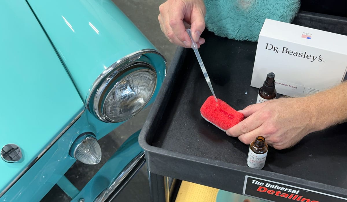 Next you apply the Nano-Resin MX Ceramic Coating. Application is the same except you use a small plastic pipet, (like a dropper), to apply a few drops to a microfiber applicator pad and you only wait 30 seconds to a minute before leveling the coating and removing any excess.