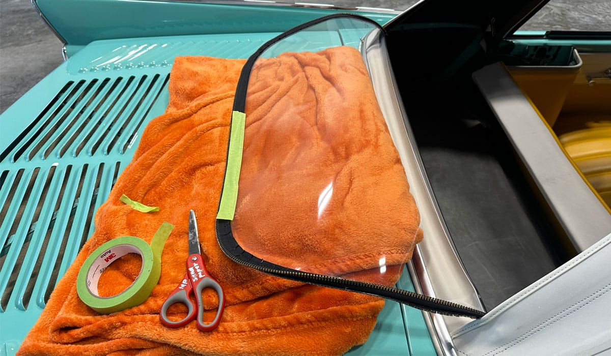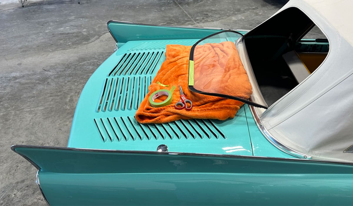 Tricky project. Upon close inspection, I found there were swirls and scratches on both sides of the plastic window. It wouldn’t do any good to only polish out the outside, (the easy side to polish), because the end results would look the same – a plastic window with swirls and scratches that looked ugly and would be difficult to see through. Luckily, this is a zipper window so I’m able to unzip the window and then lay the window down flat across the rear engine cover. In the below pictures you can see how I’m using this large, soft fuzzy blanket to lay the window onto to protect the outside surface from becoming even further filled with swirls and scratches.
