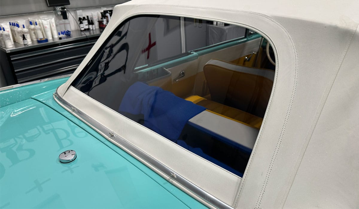 Besides the defects in the glass windshield and the paint, there were also decades of swirls and scratches in the rear plastic window sometimes referred to as Isinglass in the marine industry.