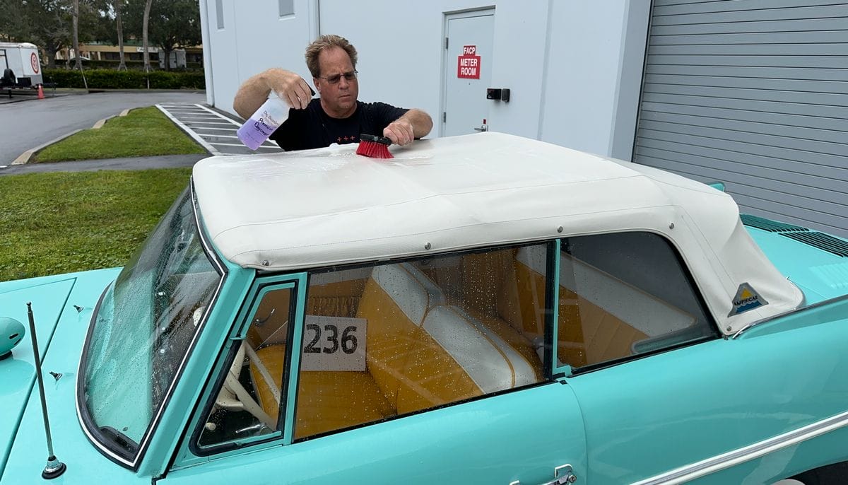 This is my first time and likely the last time. I start by spraying some Dr. Beasley’s Premium Degreaser onto the vinyl top and then agitating with a Braun Tire Brush. I don’t think this top has been thoroughly cleaned like this for years and before I started the top had a dingy appearance. After I wash and dry the car, the top will be a bright, crisp white color.