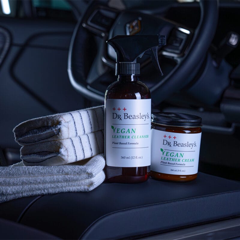 Dr. Beasley’s Vegan Leather Kit is a complete cleaning and conditioning system for vegan leather. It consists of two products – Vegan Leather Cleanser and Vegan Leather Conditioner – in addition to microfiber towels and an applicator pad.