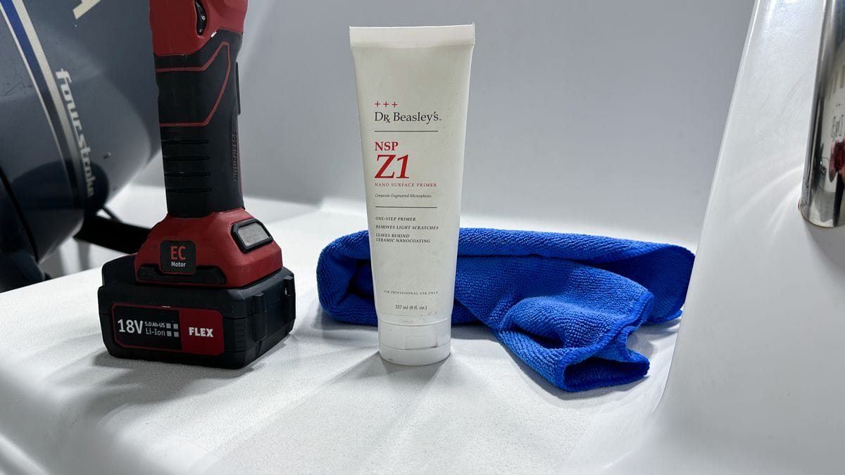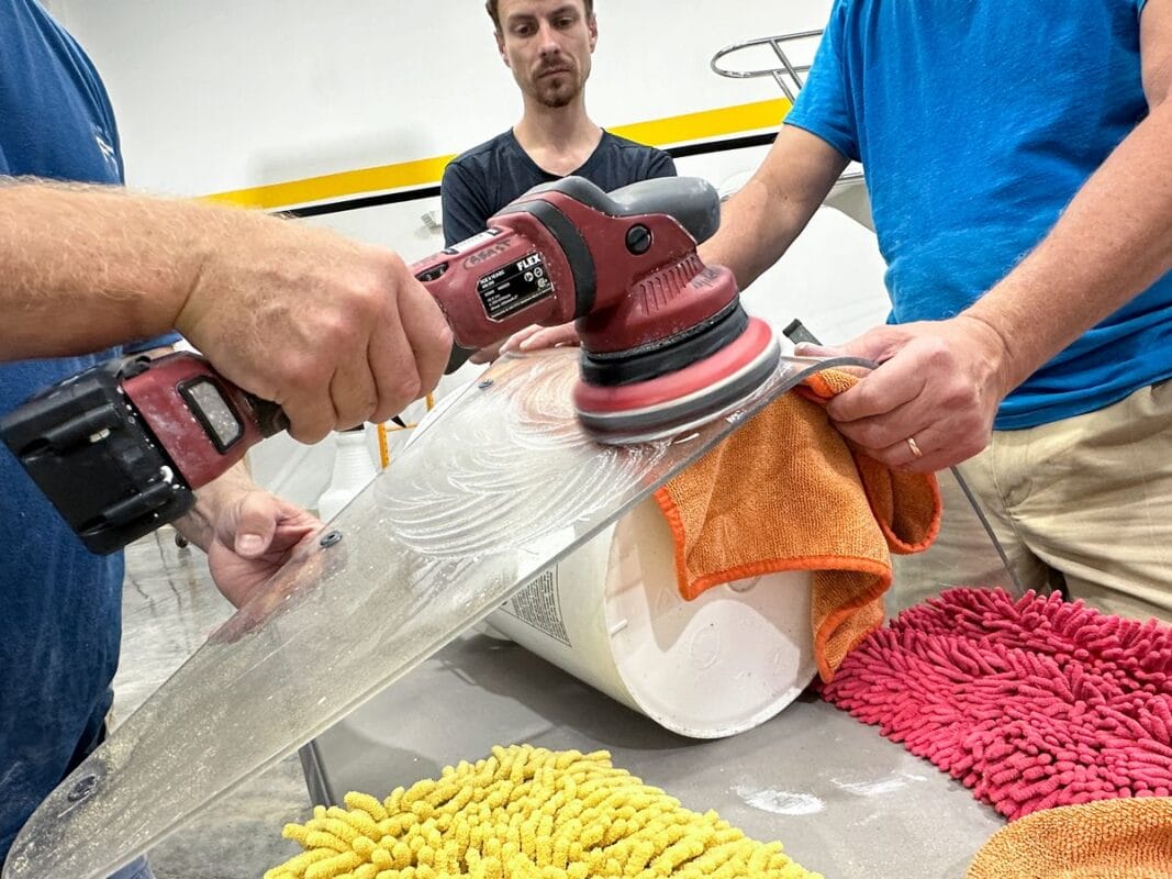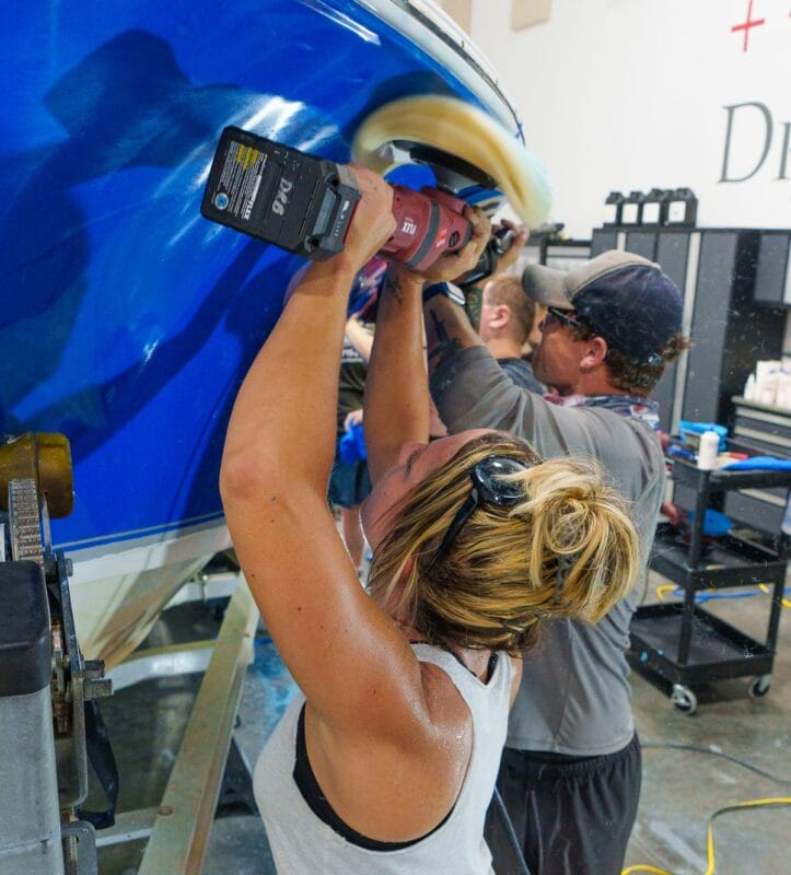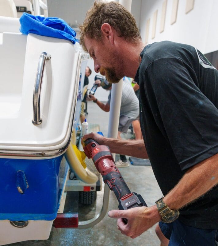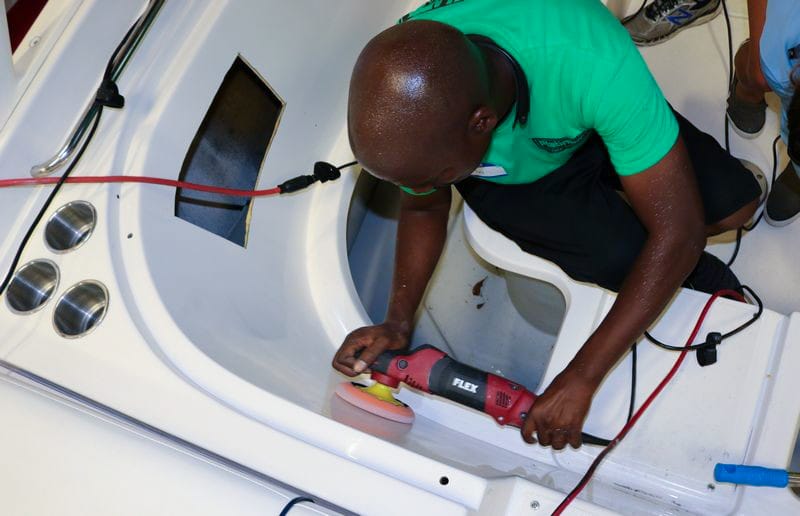 Following the machine dry sanding step, the sanding marks instilled in the gelcoat must be removed as the next step towards a show boat finish. To do so, students will use rotary polishers with wool pads and a Dr. Beasleyโs Nano Surface Primers.