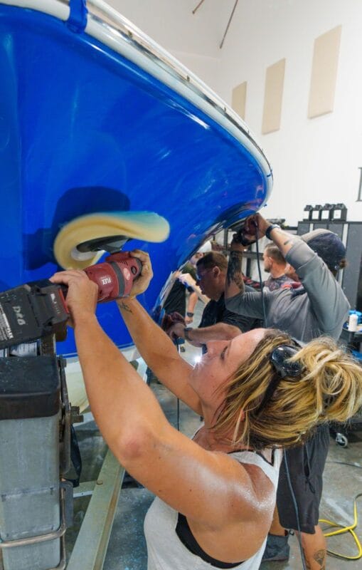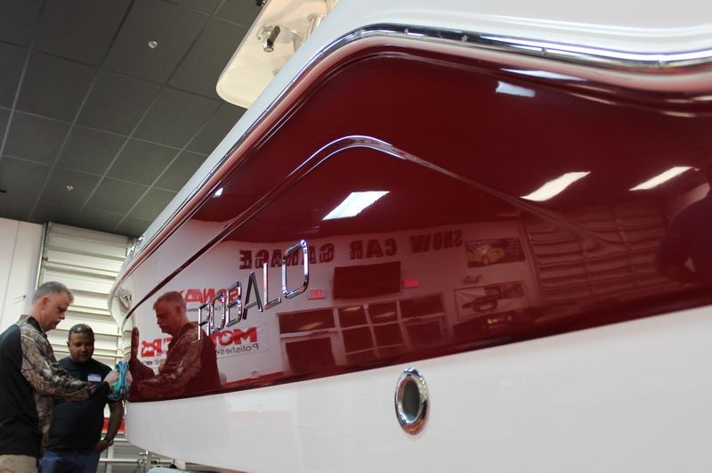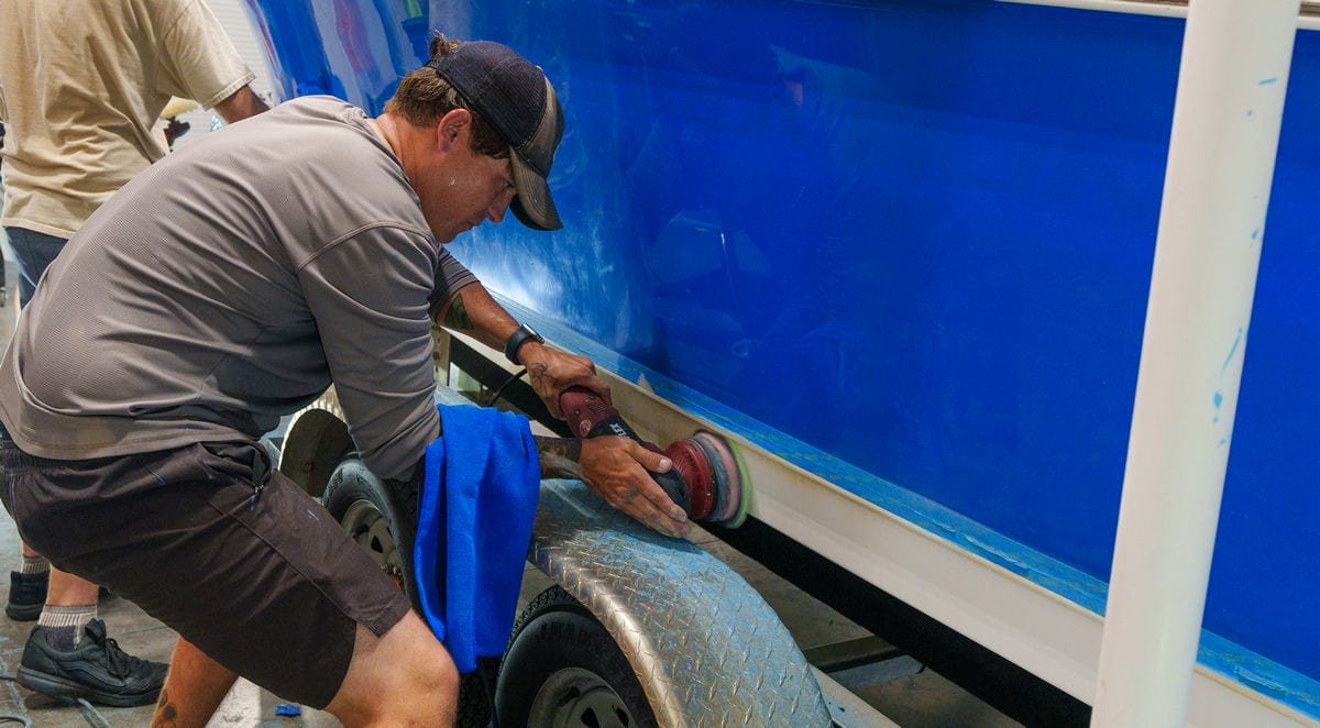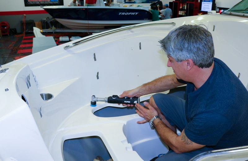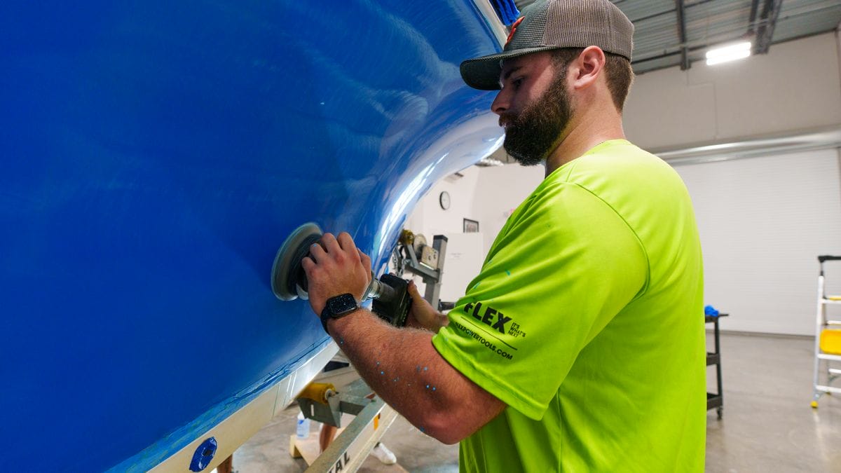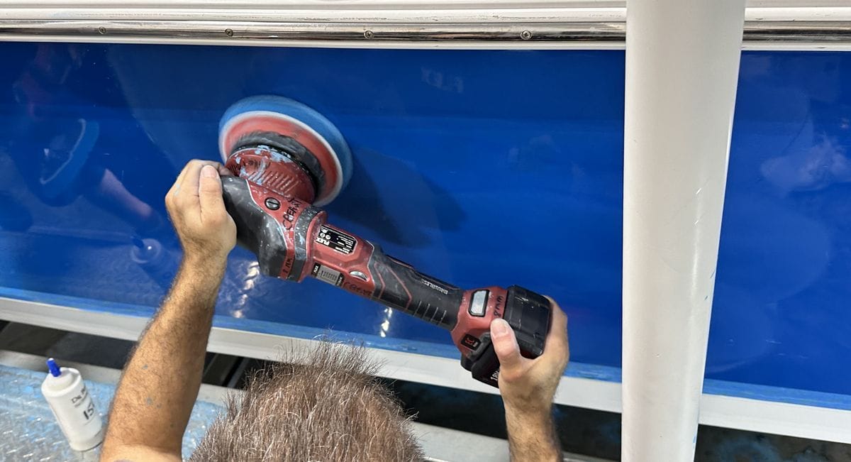 Following the machine dry sanding step, the sanding marks instilled in the gelcoat must be removed as the next step towards a show boat finish. To do so, students will use rotary polishers with wool pads and a Dr. Beasleyโs Nano Surface Primers.