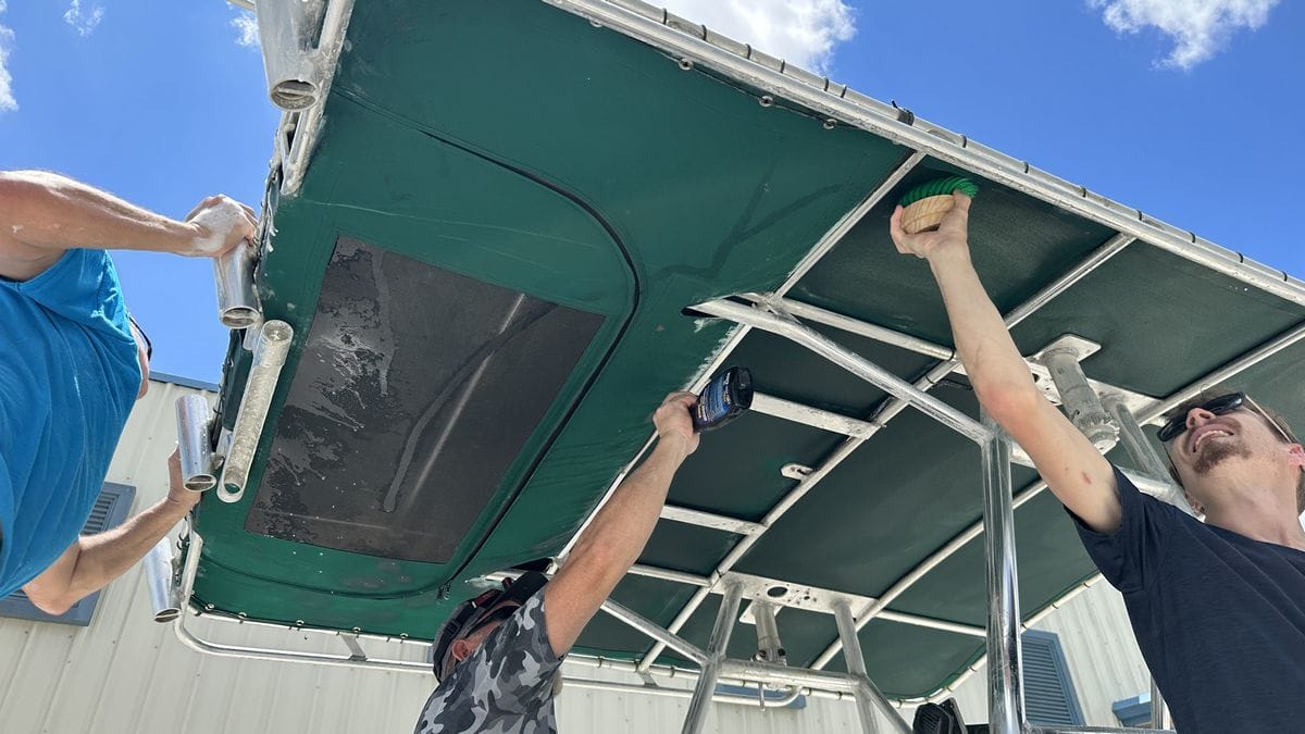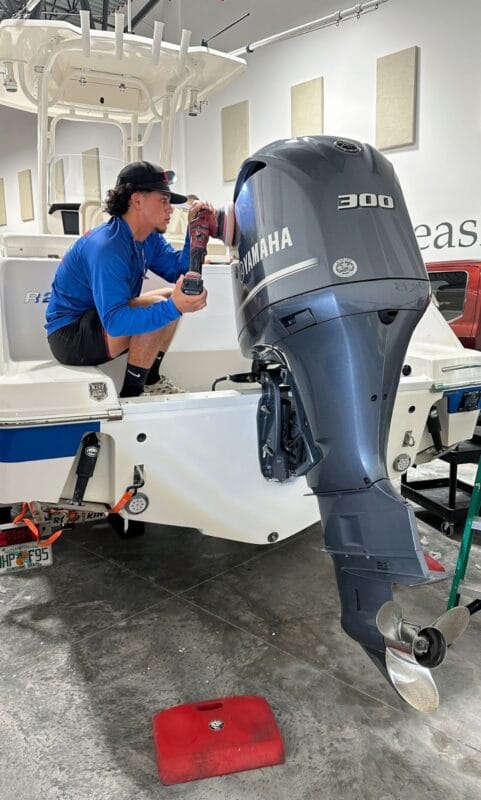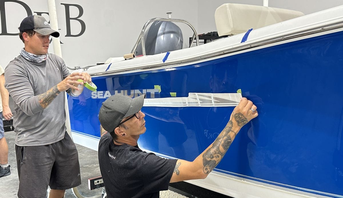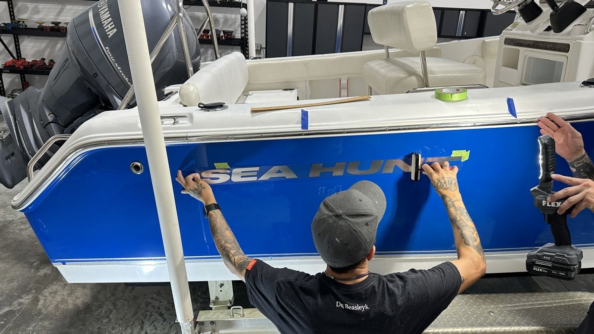 Depending upon the owner and the needs of the boat, sometimes students will get a first class lesson on how to install vinyl graphics from Yancy Martinez.