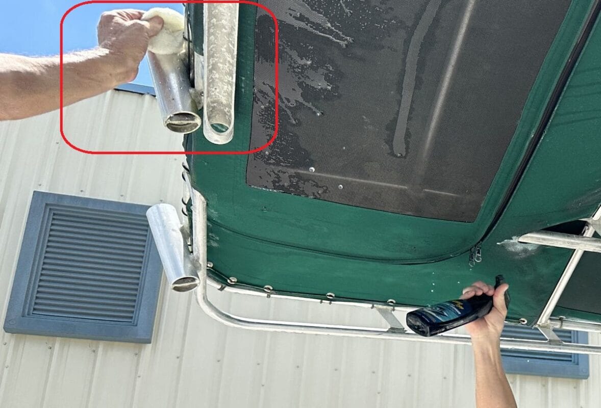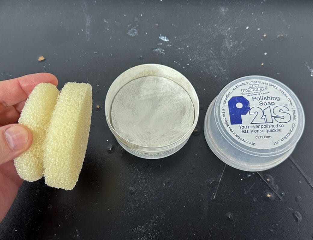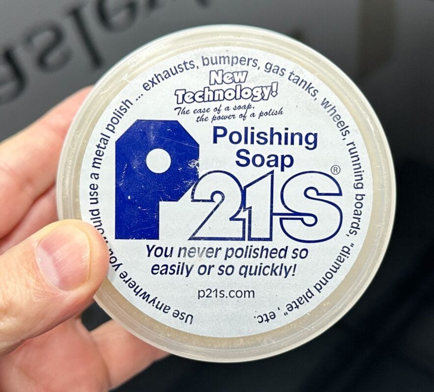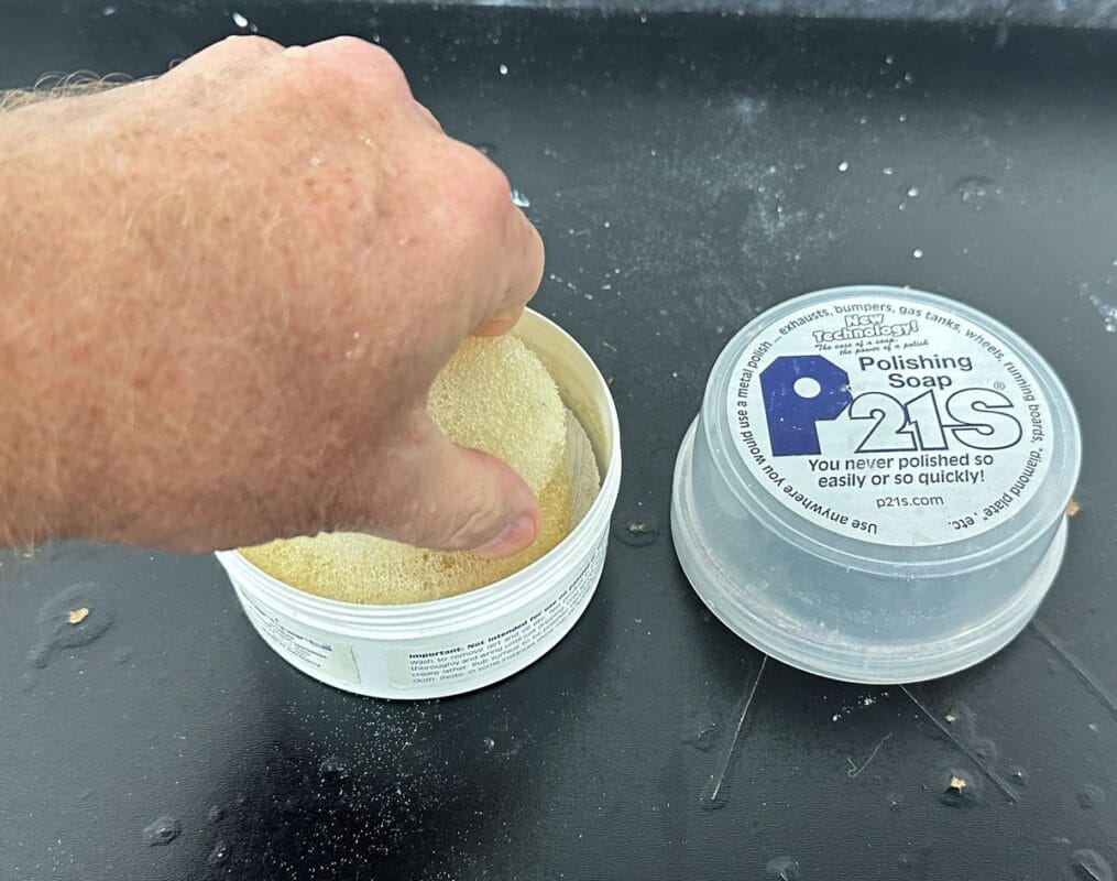 For this I like to show the P21S Polishing Soap. The reason to do this first is because this is a wet application of the polishing soap and thus it is messy. Instead of wiping the surface dry after using the polishing soap, we just leave the soap film on the metal surfaces as it will wash off when we wash the boat. You save time, steps, energy, and microfiber towels.