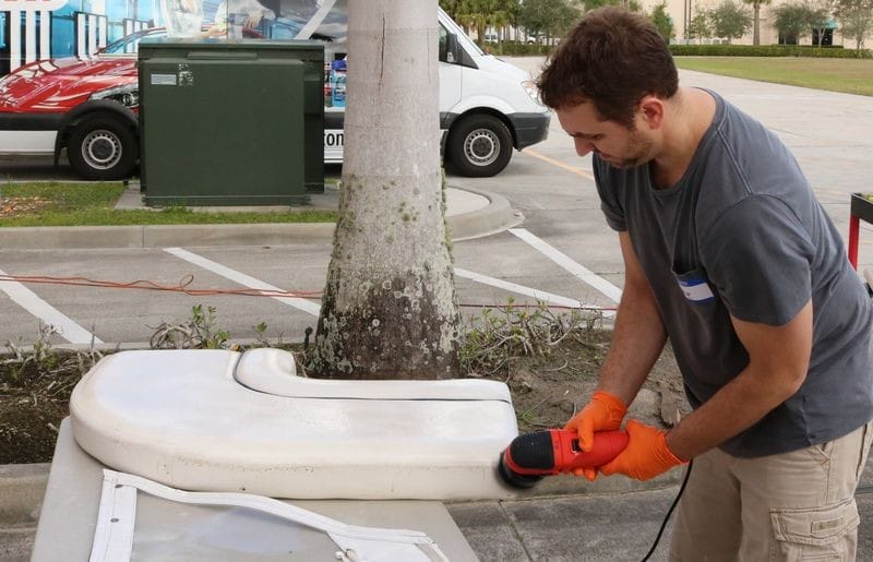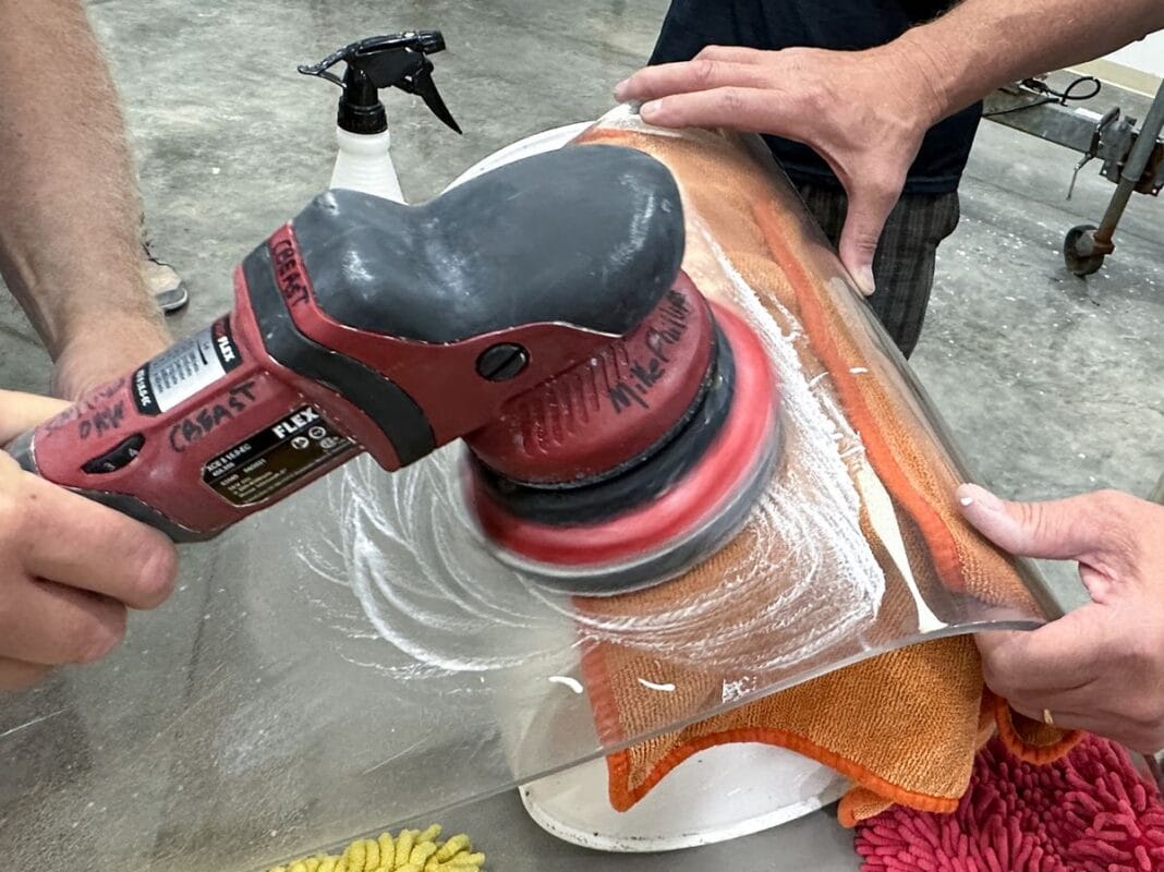 Once the sanding marks have been removed, the holograms instilled by the rotary polisher/wool pad combo must be polished out to leave a defect-free gel coat finish. Students will use orbital polishers with foam CUTTING pads to complete this step.