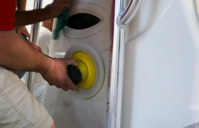 Using gear-driven orbital sanders with the Mirka Abralon Sanding System, students will learn how to machine wet sand the hull to remove deep oxidation, water stains and dock rash.