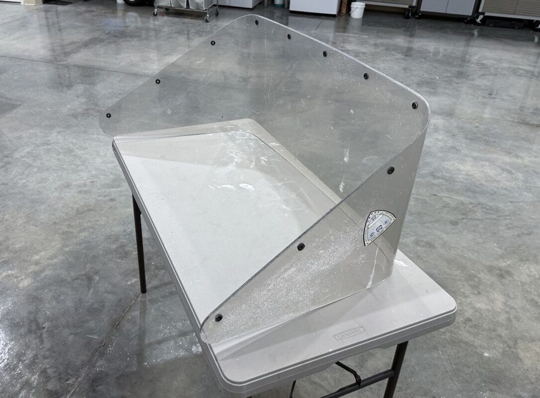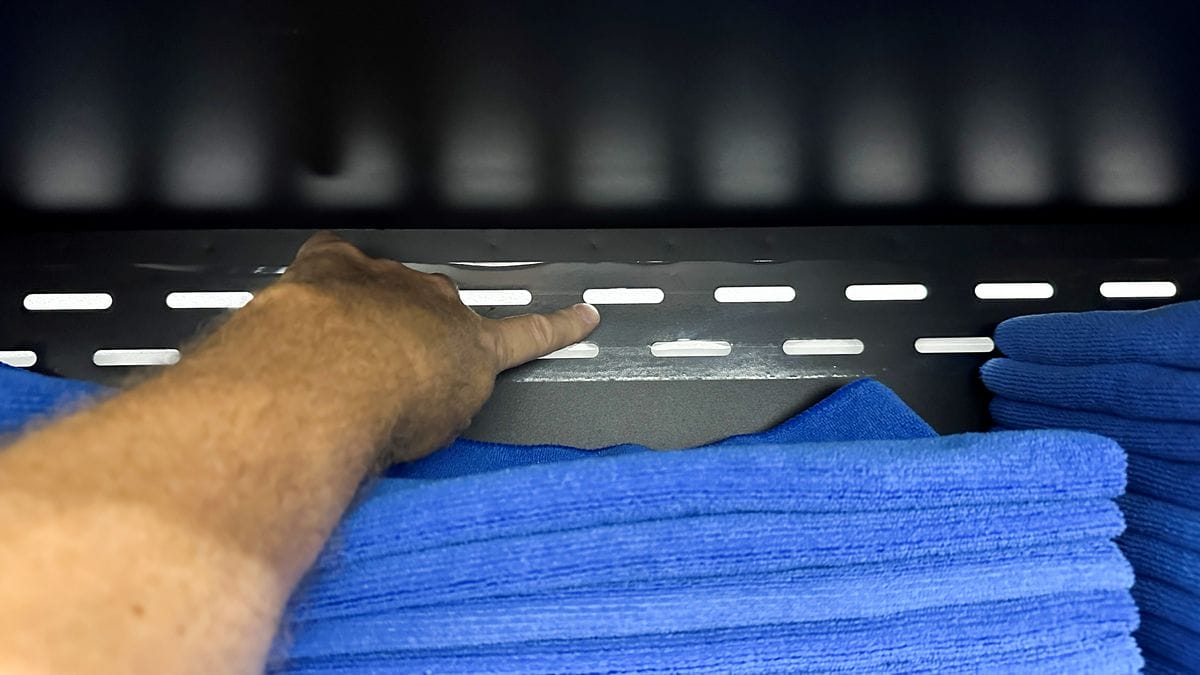 Iโve been teaching classes for a long time, and if youโre serious about teaching your own class, you need to have protocols in place to keep your microfiber tools clean and uncontaminated. We keep a table near the dryer to make it easy to move dry towels to the table, where we can then inspect visually and also with our sense of touch. We keep tweezers handy to enable us to pick out any foreign contaminants to ensure our towels are safe for wiping after polishing. The cabinet next to the table is for storing clean, inspected, and folded towels.