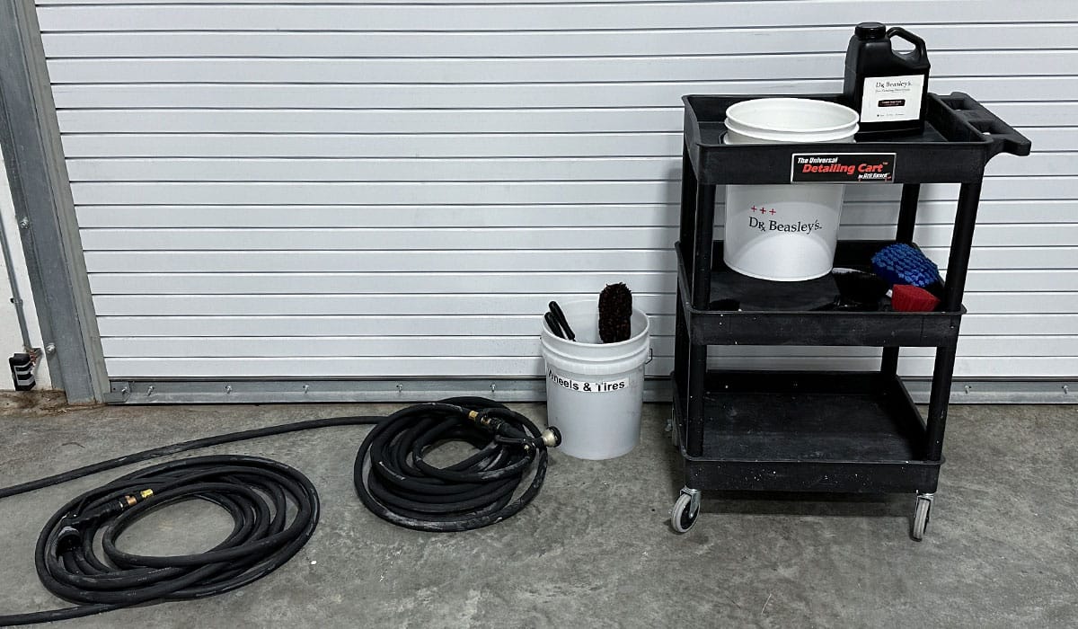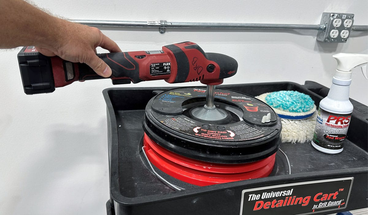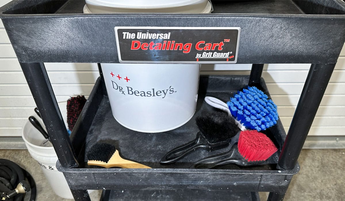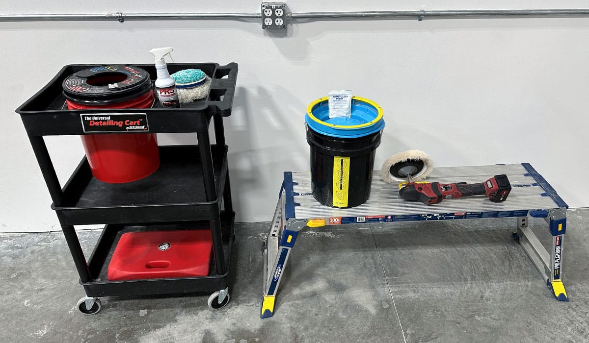 Personally, I always use the Grit Guard Universal Detailing Cart to hold my wash buckets off the ground, as this way neither my students nor I have to bend over each time we need to dunk our wash mitt in the soapy boat wash solution. Plus, you can push it around the boat as needed, and it also works great for holding tools and products.