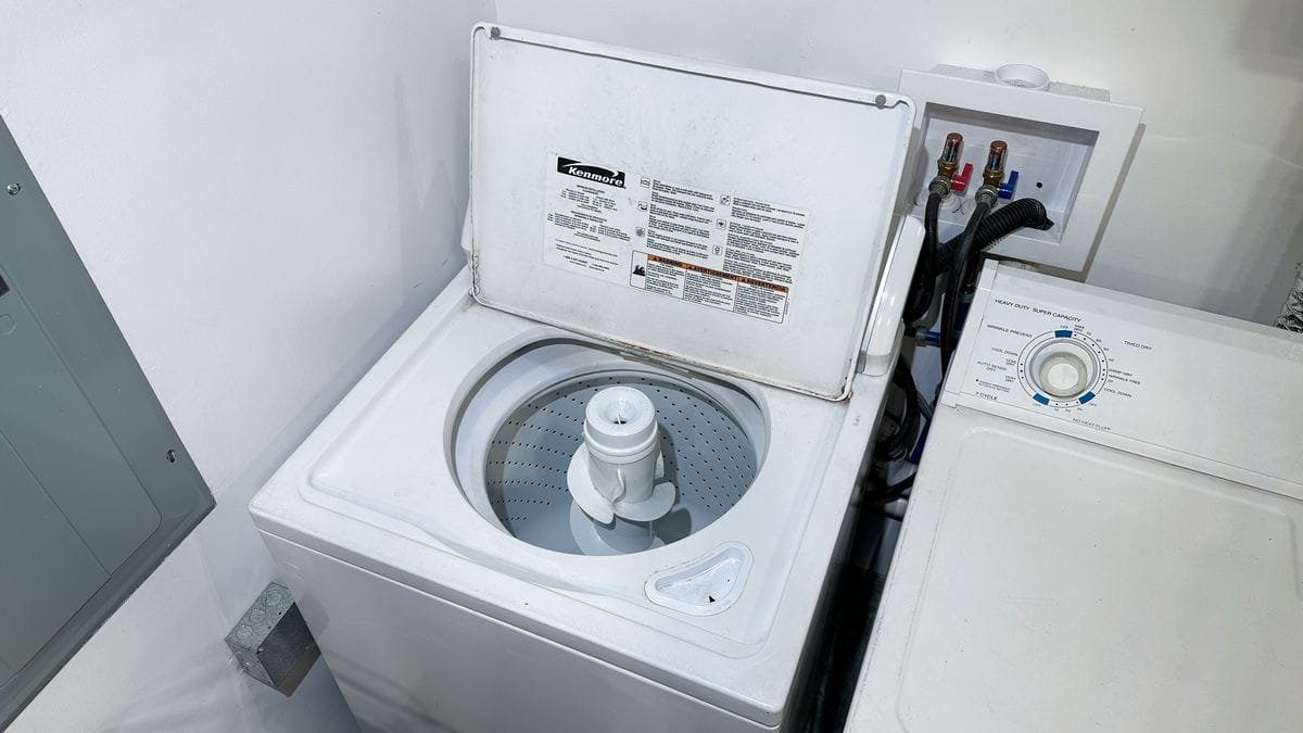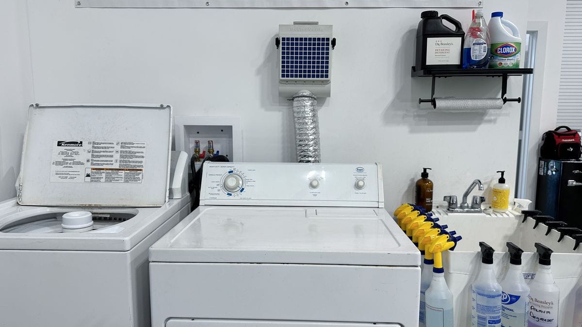 Our unit is the Roper brand, a sub-division of General Electric, and it works GREAT. Because there was no option to safely route the dryer exhaust out of the building, we purchased a BetterVent Indoor Dryer Vent by ADR Products, which is a wall-mount dryer exhaust and filter, off Amazon for around $70.00. While not a perfect solution, it gets the job done. If your shop is going to do any type of PPF or Wraps, then youโll want your washer and dryer in a separate room anyway.