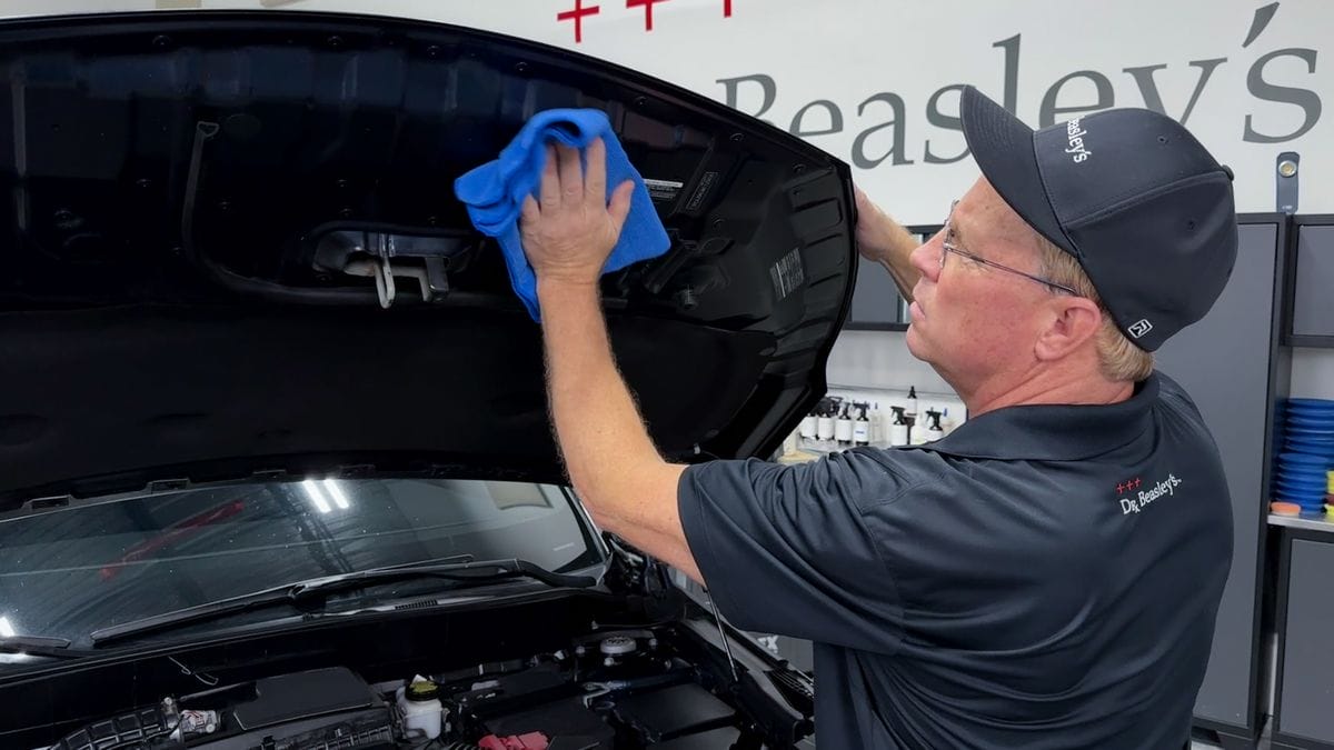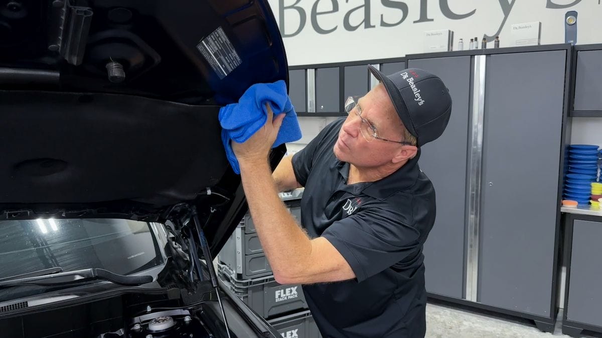 To finish cleaning the engine compartment I like to apply a high gloss detail spray like Dr. Beasley’s The Final Finish to all painted, color-matching surfaces under the hood in order to restore a clean, shiny finish.