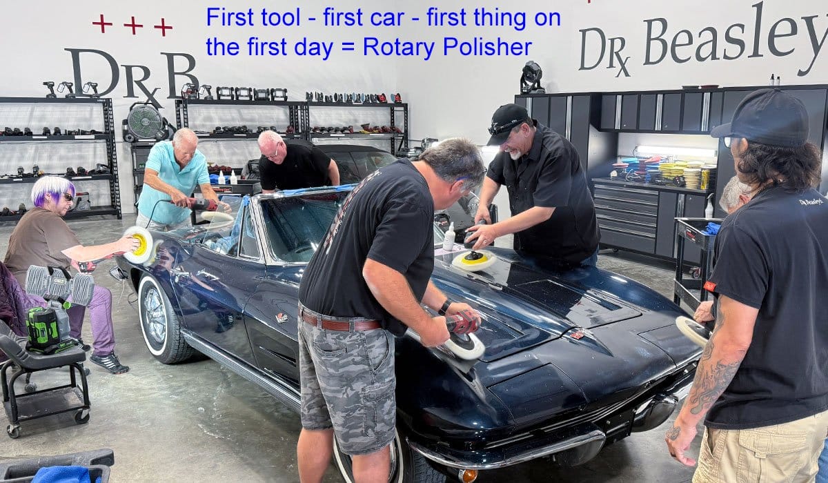But the paint on this 1966 Corvette Race Car was so badly filled with swirls and scratches, I let the class hone their rotary polisher skills as a first step, and then we used the Dr. Beasley’s NSP Z1, which is a ceramic all-in-one or AIO. In the old days these were called cleaner/waxes. Dr. Beasley’s Z1 uses ceramic for protection instead of wax – that’s the big difference.