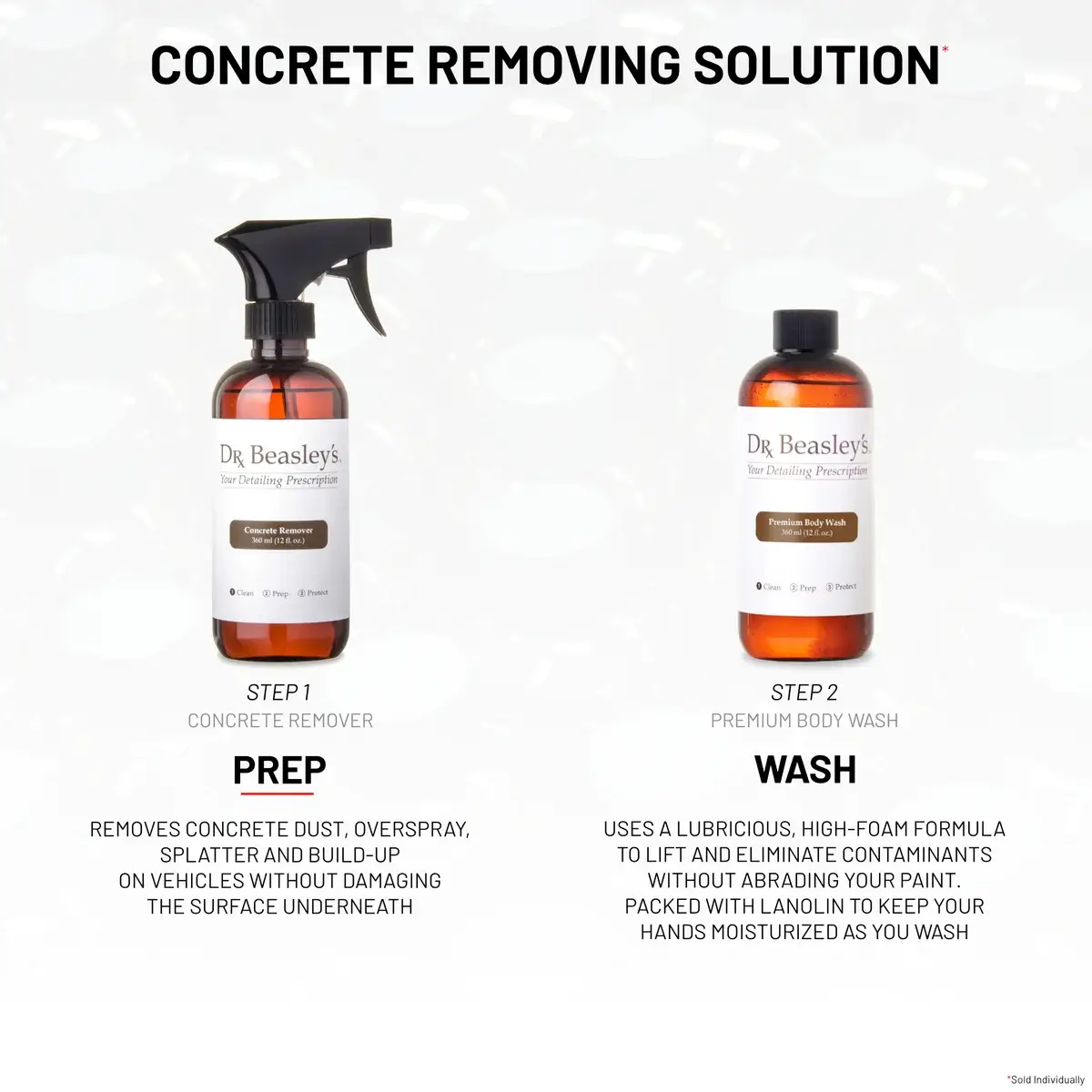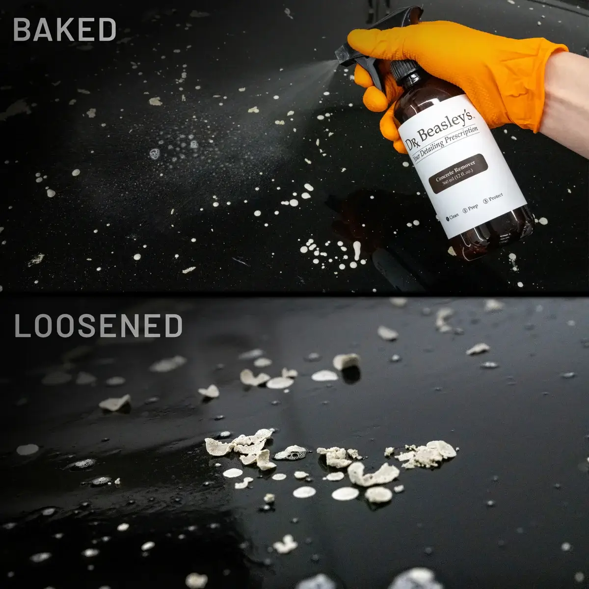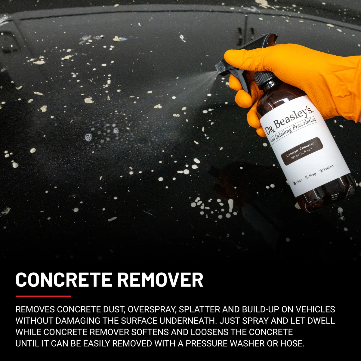 You never know when some concrete might kick up and dry on your finish. In cases like those, having some Concrete Remover in your glovebox is a life saver.