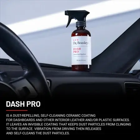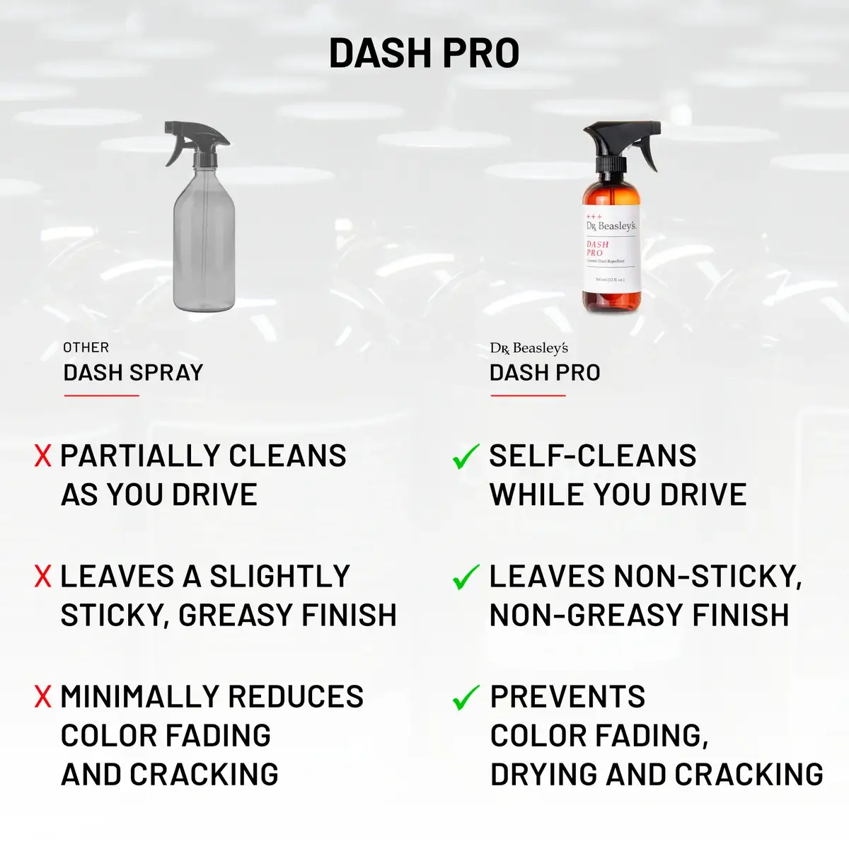 Once applied, Dash Pro creates a slick surface that uses the vibrations of your vehicle to push dust right off the dashboard. No need to wipe down or use a dust cleaner. Your dash will stay clean all by itself.