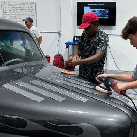 The second day of this course builds on the skills taught the day previous. Students will learn two paintwork correction techniques: aggressive machine dry sanding for orange peel removal (typically reserved for show car work) and All-in-One or AIO paintwork correction (typically used in production work). Students will use this knowledge to complete paintwork correction on real test vehicles.