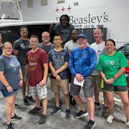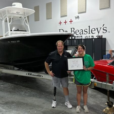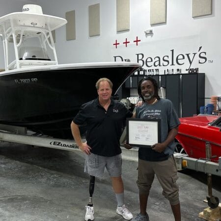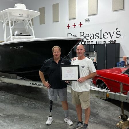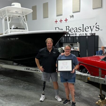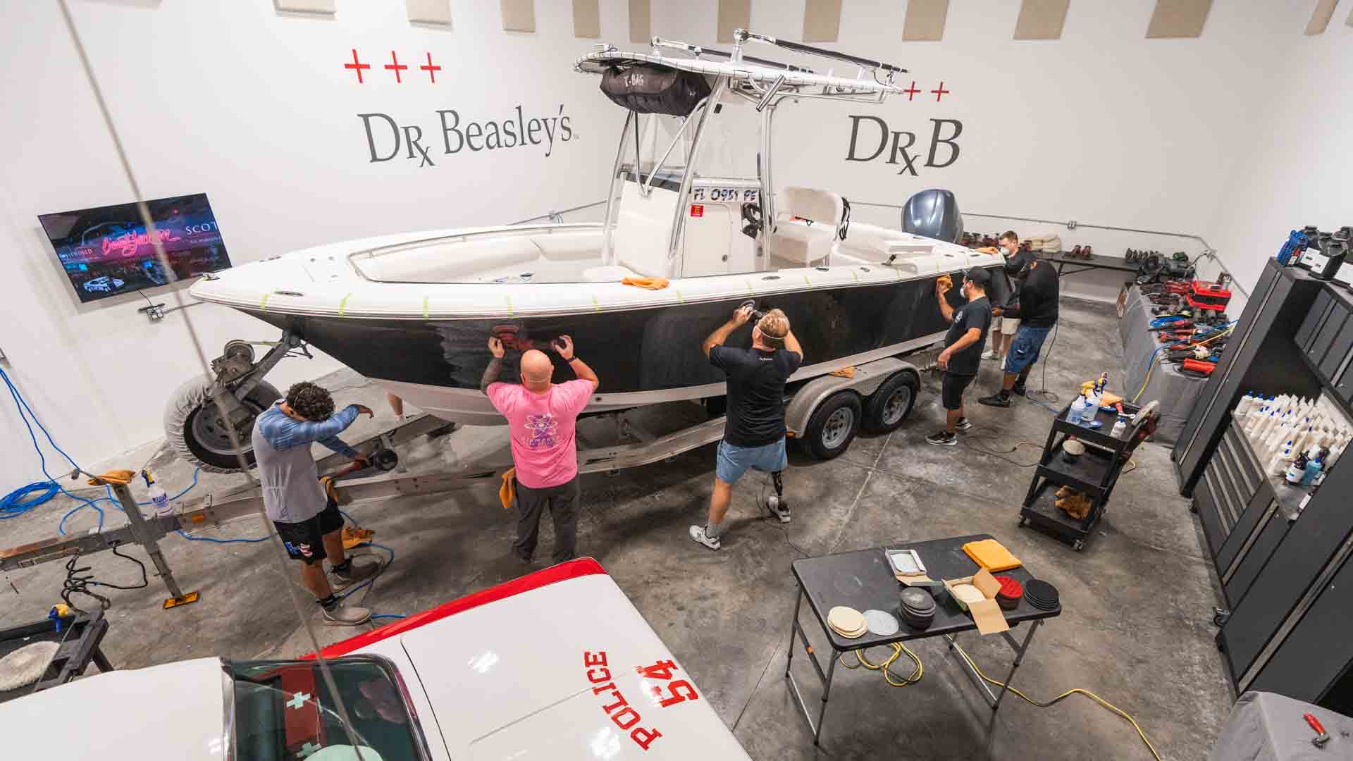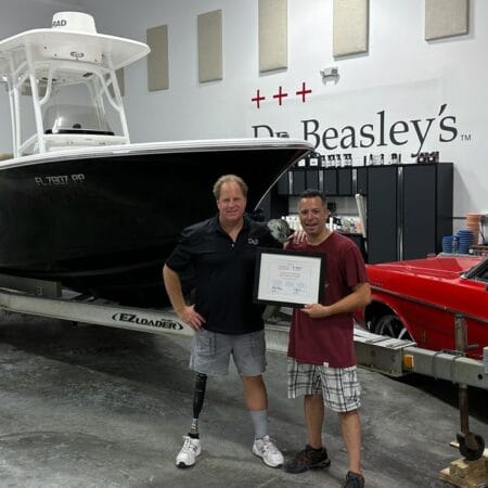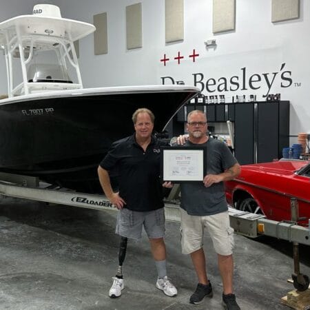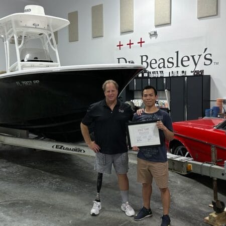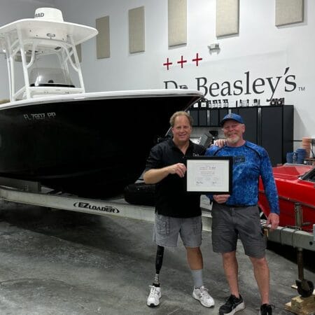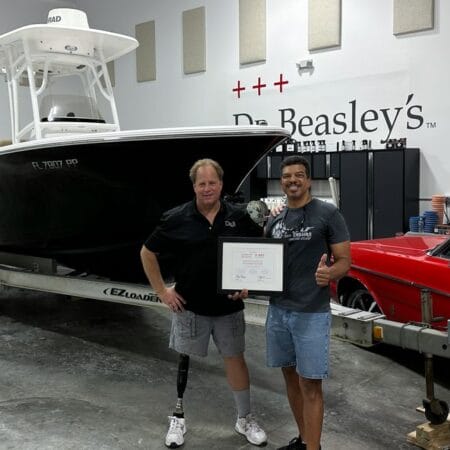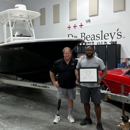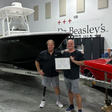 Finally, the newly restored gelcoat must be protected with a durable marine ceramic coating — in this case Dr. Beasley’s Boat Coat Pro. Students will apply this coating to the entire hull, learning step-by-step how to properly install a marine ceramic coating.