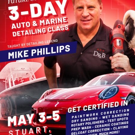 The third day of this course teaches students how to restore and protect oxidized gelcoat on boats, yachts and other marine vessels to create a show car (er, boat) finish. This is an important skill for professional detailers operating in a coastal environment or any area near a large body of water — basically, anywhere there are boats to detail.