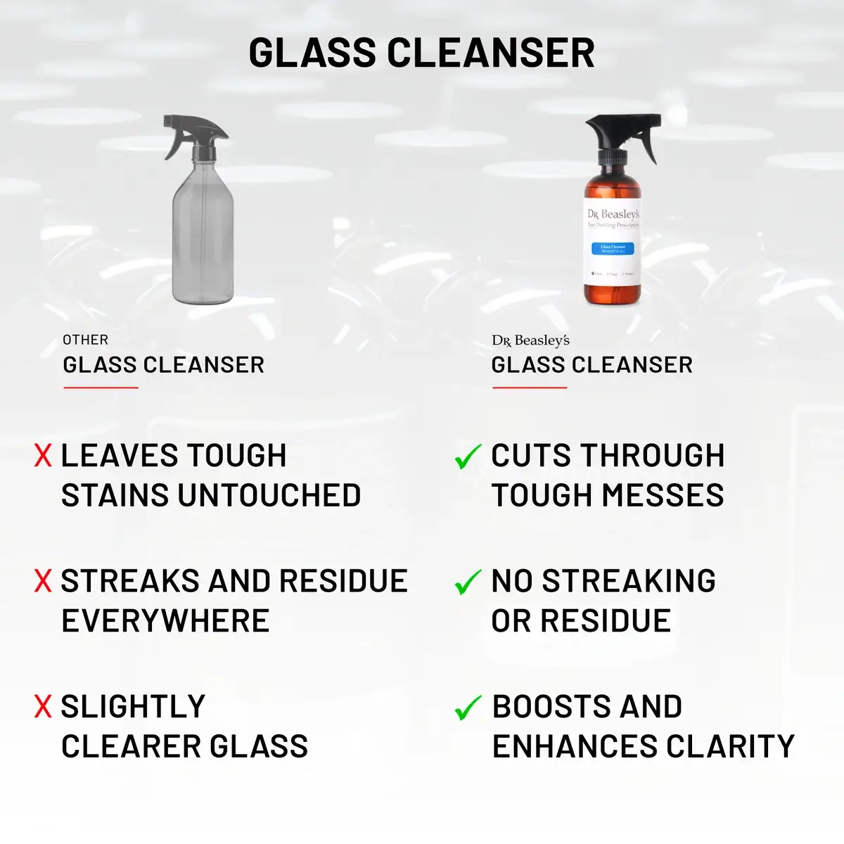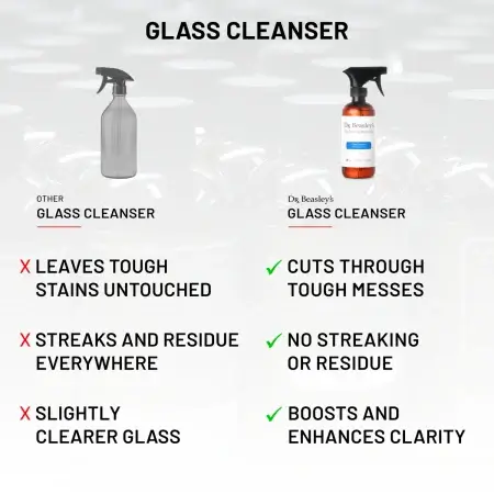 The last thing you want out of a glass cleaning product is streaking or residue left over from application. You want your glass to look clear as day, not like it’s covered in smears. We feel the same way, which is why we painstakingly formulated Glass Cleanser to leave absolutely no excess residue or streaking. The only thing you’ll be left with is perfectly clear glass.