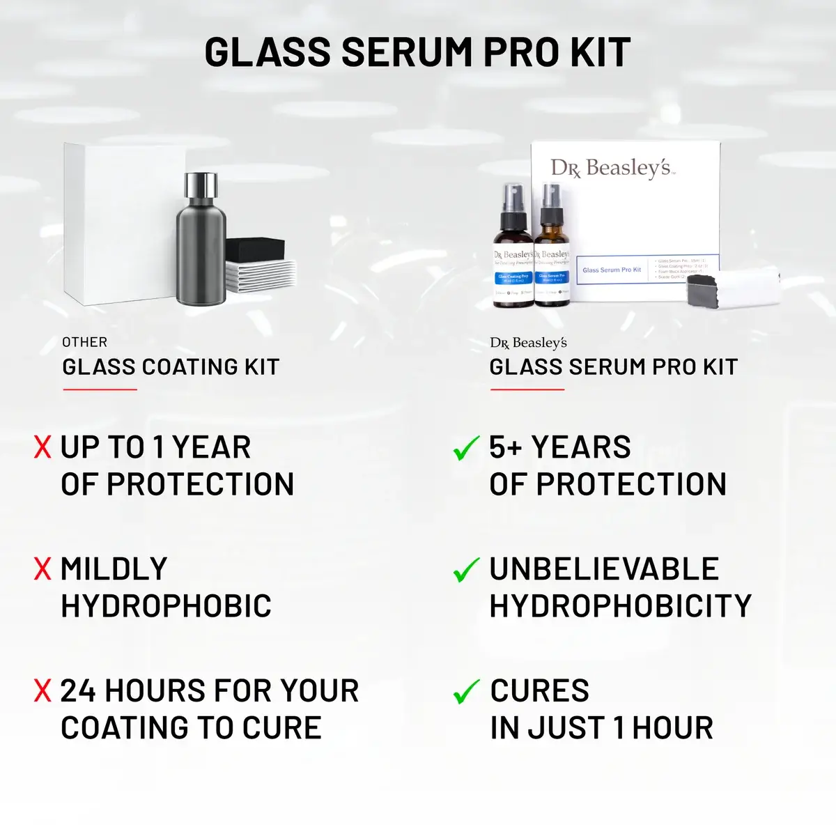 Some glass coatings are so short-living, they’ll wear off as soon as you use your wipers. Others last a few months, maybe a year. The Glass Serum Pro Kit, on the other hand, can last five years or more. Through rain, sleet, hail and snow, you can be sure Glass Serum Pro will weather them all. It’s so durable, you’d have to machine buff it just to get it off!