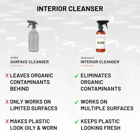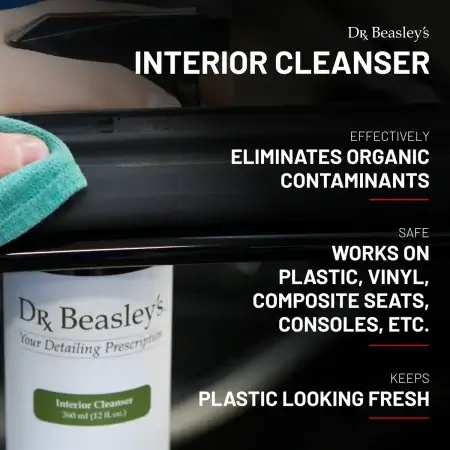 Your car’s interior plastic surfaces are practical magnets for sweat, body oil, food grease, you name it. All of these contaminants embed themselves in the surface, leaving unsightly stains and a faded appearance. Ridding your dashboard of these blemishes can be a pain – unless you have Dr. Beasley’s Interior Cleanser. Formulated specifically to break down and eliminate organic contaminants, Interior Cleanser pulls these substances out of the surface entirely so they can be dissolved with the wipe of a microfiber towel. It’s sure to be a go-to for any interior plastic tidying.