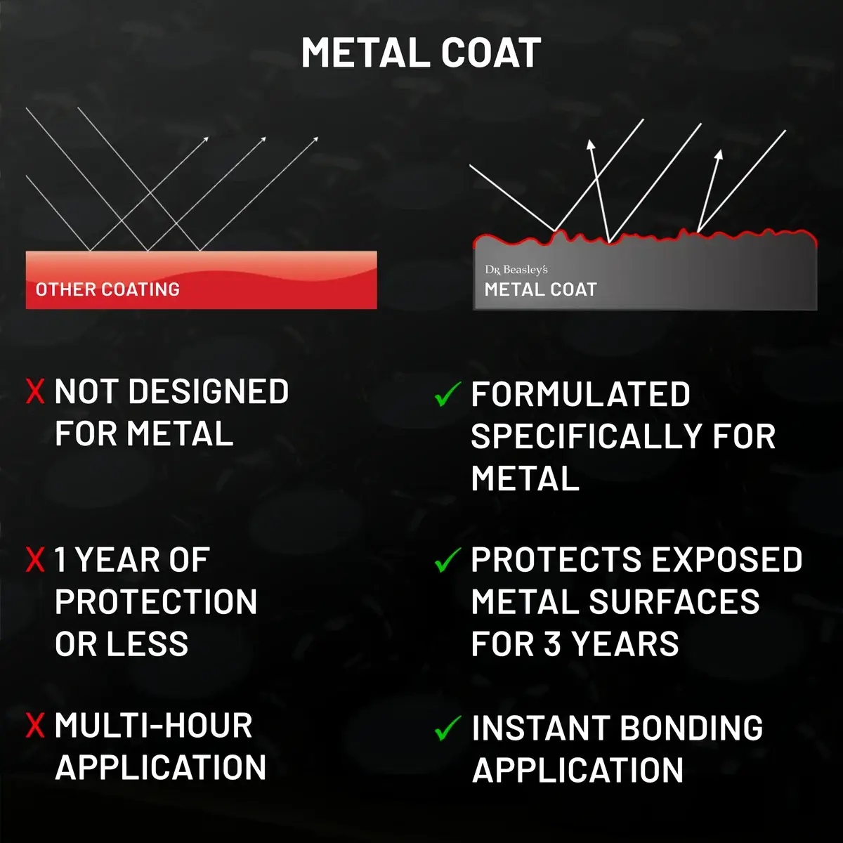 Stainless steel unfortunately doesn’t stay stainless for long. Metal Coat’s cross-linked bond helps stainless steel live up to its name with a powerfully resistant barrier to resist staining and etching. And with incredibly long-lasting protection, you’ll get years of resilience on daily drivers and practically permanent coverage on low-use vehicles.