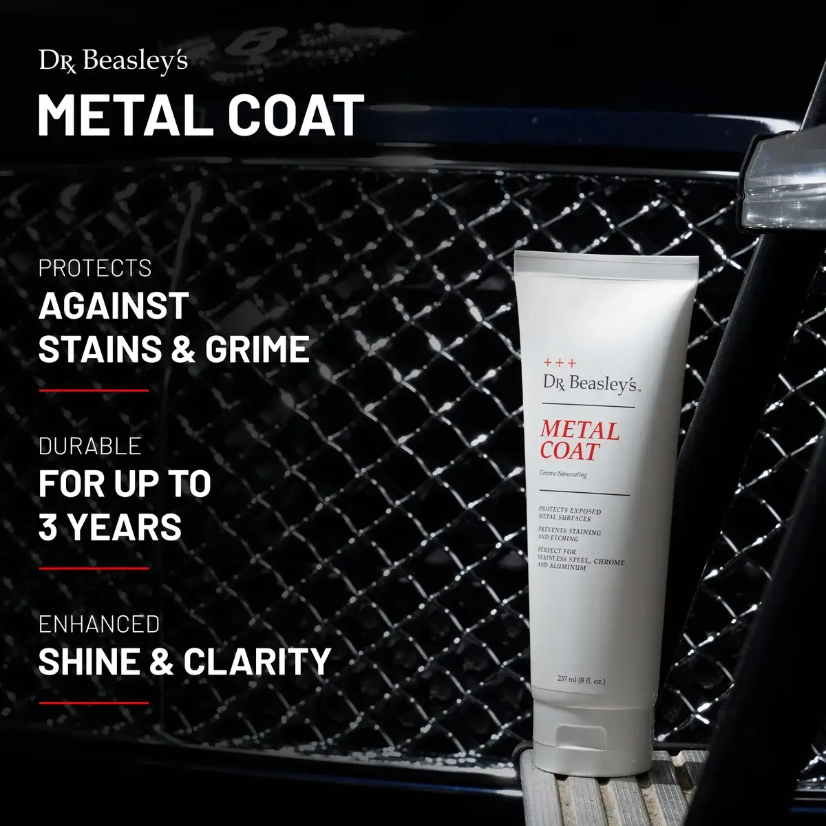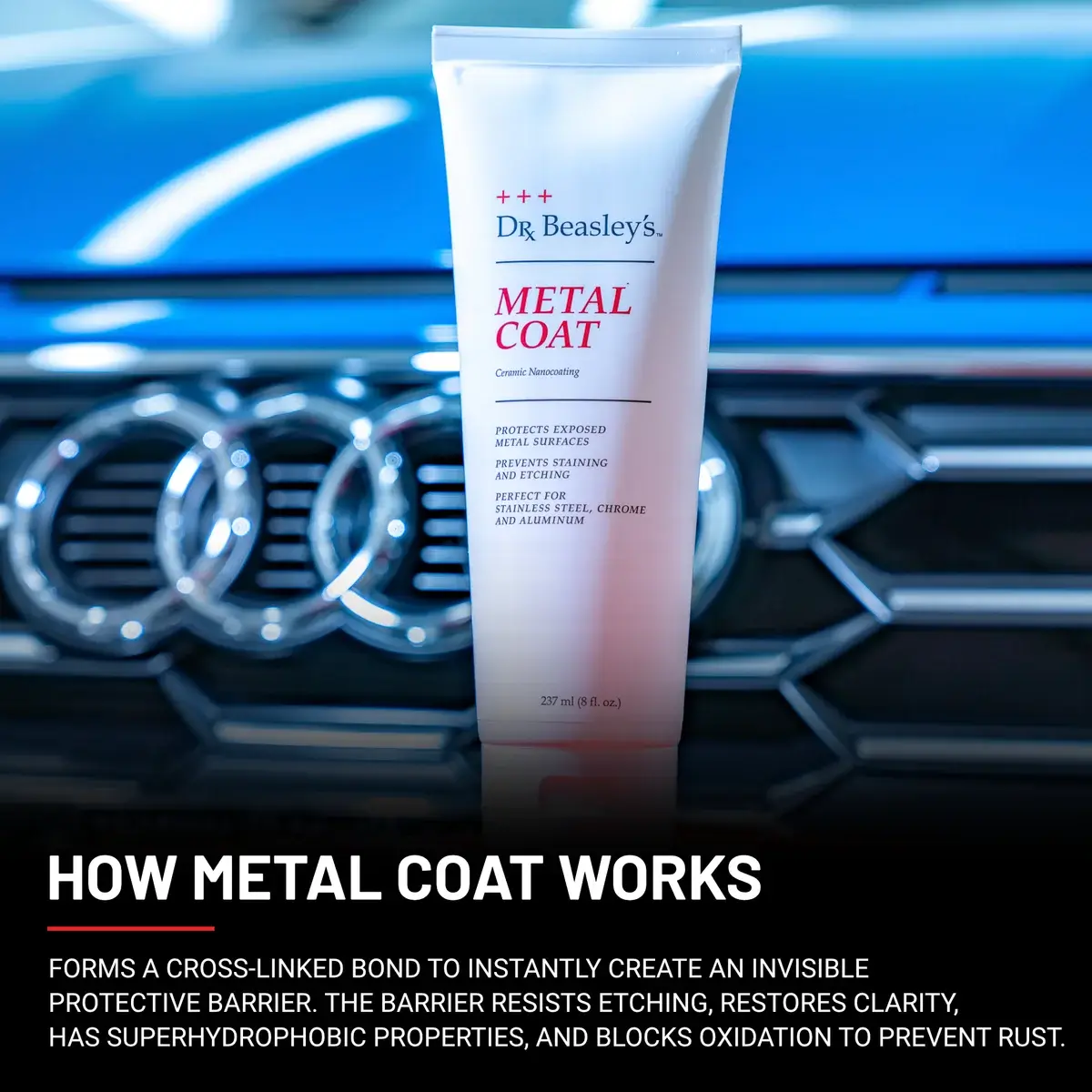 Chrome and stainless steel shine like no other, but between the hard water spots, oxidation and staining, maintaining a reflective metal surface can be a headache. This is especially true on a vehicle’s chrome or aluminum trim – they’re constantly exposed to exhaust fumes, brake dust and acid rain, inevitably leading to a dulled appearance. Metal Coat solves this by forming an invisible coating over your metal surface that restores its gloss while protecting it from dulling contaminants, even rust.